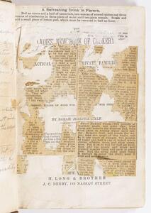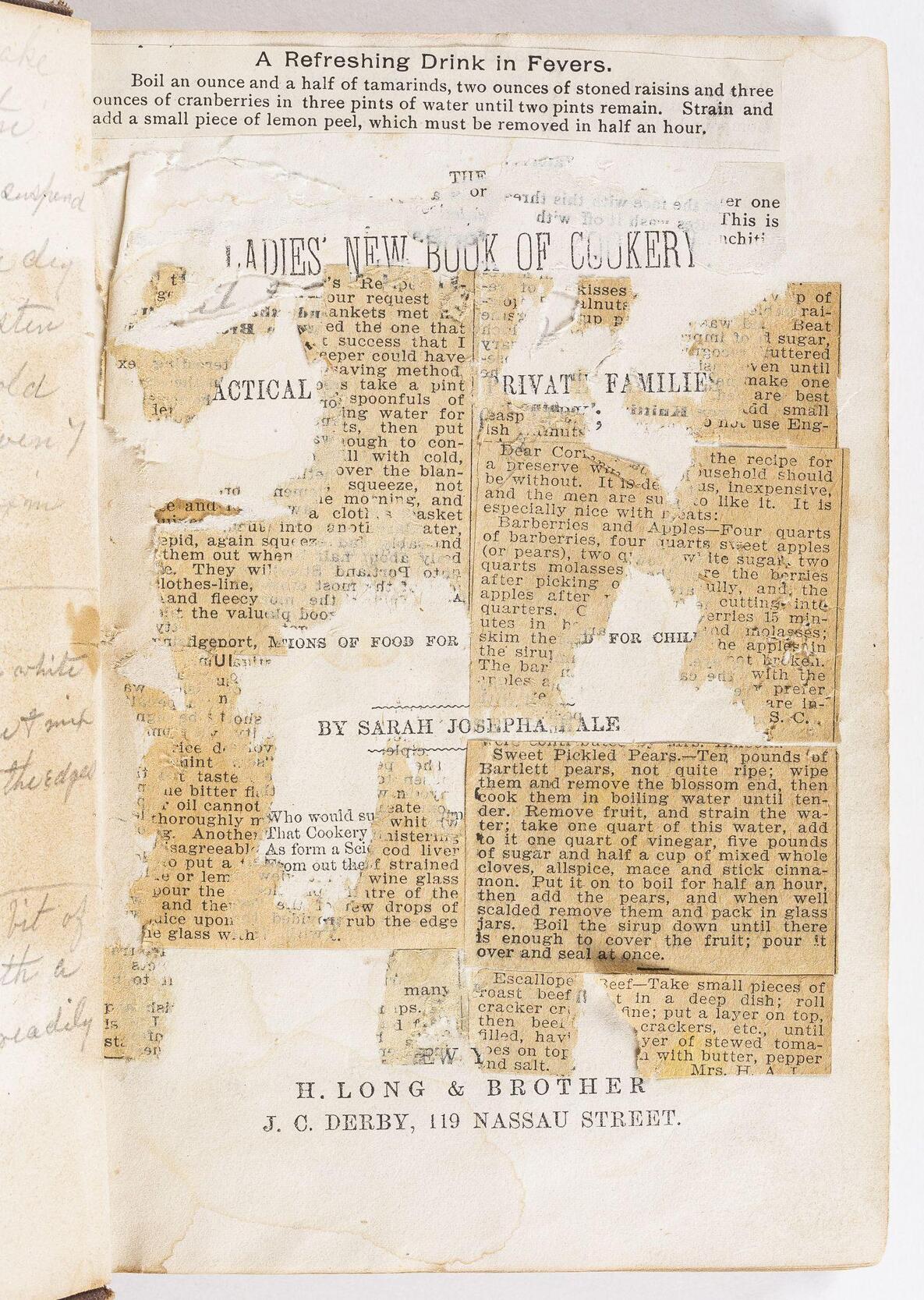 However, while generic and formal fluidity is a common feature of nineteenth-century newspaper recipes, these very same writerly transgressions can make locating them in libraries and archives complicated. Printed books were often repurposed as repositories for recipes clipped from newspapers, which were pasted over the original text.[4] When these texts then appear in institutional collections, the likelihood that they will be categorized as “recipe books” is understandably low. In some cases, the newspaper clippings may have even been removed at some point to reveal the text underneath (Figure 1). As a result, while commercial, printed cookbooks are relatively straightforward to locate—if they have been preserved—other forms of texts that were utilized as cookbooks or were modified by their users remain much more difficult to pinpoint.