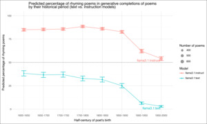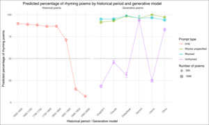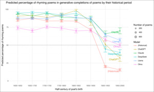 Meanwhile, the right-hand portion of the graph, a distant reading of rhyme not in historical but generative verse, shows several striking findings. On average across the LLMs, prompts for a rhyming poem (shown in blue) and prompts simply for a poem without specifying whether to rhyme (shown in green) produce a body of artificial verse composed of 95% rhyming poetry. Not only is this incidence more than in any historical period of actual human-authored verse, but its similarity across these two categories of prompts suggests a remarkably stubborn association between the genre of poetry and the form of rhyme within these models. Furthermore, whether prompted simply to write a poem, a rhyming poem, or an unrhyming poem (shown in purple), generative models—despite the overwhelming bias in their training data toward the contemporary—rhyme more often than poets born in the late twentieth century, and sometimes significantly more. Finally, even prompting the models for an unrhyming poem yields rhyming poems 50% of the time on average across the models, more than seven times as often as in the historical reality of postwar poetry (7%).