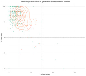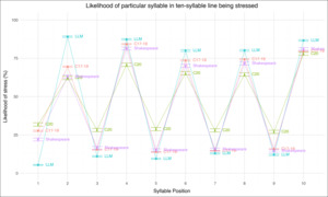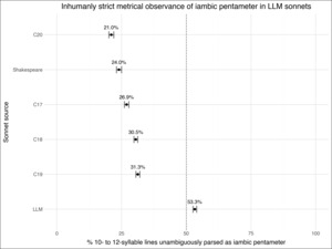 How strictly observed is the rhythm of generative sonnets’ iambic pentameter, and how does it compare with sonnets at different moments of their own literary history? Do LLMs write lines closer to From fair -est crea -tures we desire increase, for which no alternative parse—like the trochaic From fair -est crea -tures we desire increase—offers a plausibly competing scansion? Or do they write lines closer to Feed’st thy light’s flame with self -substan -tial fuel, which might plausibly also be scanned with a trochaic inversion, beginning Feed’st thy light’s flame?