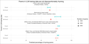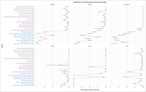 At the same time, significant discrepancies pertain across these models alongside their similarities. When not specifying whether to rhyme, models overwhelmingly produce rhyming verse, ranging only narrowly from 91% to 100% in likelihood. Yet when prompted not to rhyme, this range widens. Google’s Gemini Pro stubbornly rhymes 94% of the time even when instructed not to do so, as does the open-source model OLMo2 (83%). Other models are formally more obedient to their prompt: Anthropic’s Claude models rhyme 46% of the time; OpenAI’s ChatGPT models, 18%; DeepSeek, 31%; and Meta’s Llama, 25%. Nevertheless, all these frequencies of rhyme far exceed the past century of the form, to a highly statistically significant degree.
