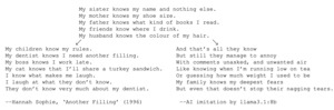 Still, given these variations across models, one might question whether the bias toward rhyme stems from the explicit mention of poetic form in the prompts themselves. Prompting not to rhyme a poem, after all, still invokes the concept of rhyme; and indeed, one of the most difficult aspects of working with LLMs is how sensitive their results are to the wording of its prompt. For this reason, I conducted a subsequent step to this experiment measuring rhyme in generative verse, this time avoiding the reliance on explicit prompting for rhymed and unrhymed verse by instead instructing models to “complete” existing poems which may or may not rhyme. For example, prompted with the first five lines of an unrhyming twelve-line poem from the 1990s, the Llama 3.1 LLM quickly veers back into rhyme (Figure 3). The first three lines of this generative imitation (shown at bottom right) continue the poem’s unrhyming form, with lines ending “know” and “annoy” (perhaps a slant rhyme) and “air”. But it then pivots into perfectly rhyming couplets, with lines ending “tea” / “be” and “fears” / “tears”. This formal pivot mirrors a thematic one, one that even brings it into contradiction with the poem’s beginning: if “My sister knows my name and nothing else” (actual), how would “My family know my deepest fears” (imitation)? The actual conclusion to the poem (“I laugh at what they don’t know. / They don’t know very much about my dentist”) surprises the reader with a touch of irony and continued banality after setting up an expectation for something more profound—an expectation eagerly satisfied by “my deepest fears” in the generative model’s completion of the poem.