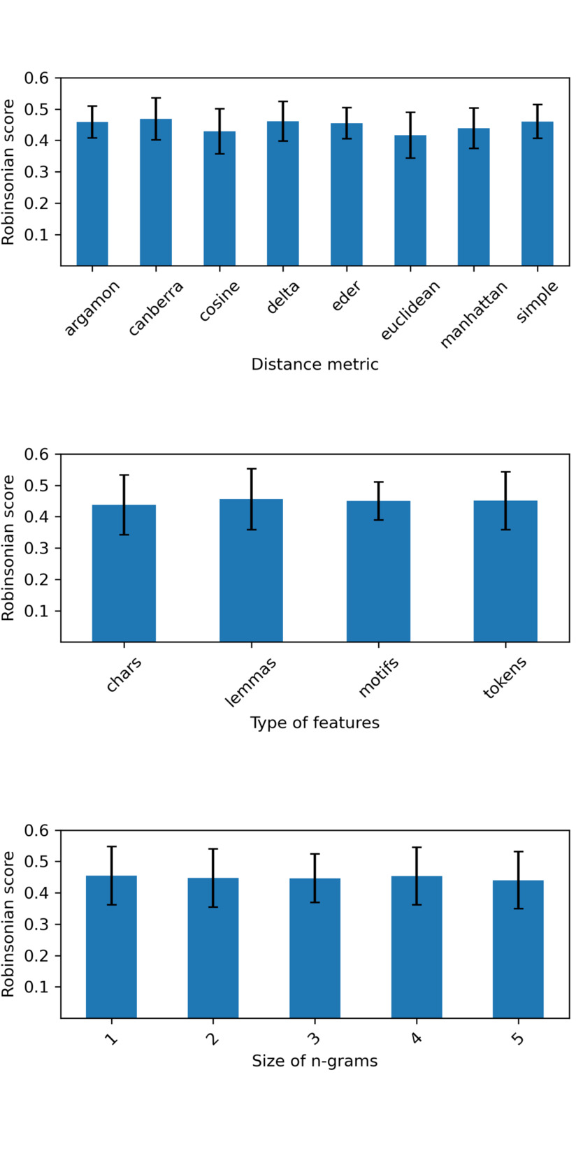 We compared different lengths of n-grams (unigrams to pentagrams) of tokens, characters, lemmas and motifs (see Table 2 for examples of different types of features). The texts of the corpus were represented by the top 500 features with the highest relative frequency. The different distance metrics we used come from stylo R (Eder et al.), in which we entered our corpora. Figure 2 shows the percentage of the distance matrix (calculated for the Leblanc corpus) that is Robinsonian for different feature configurations.
