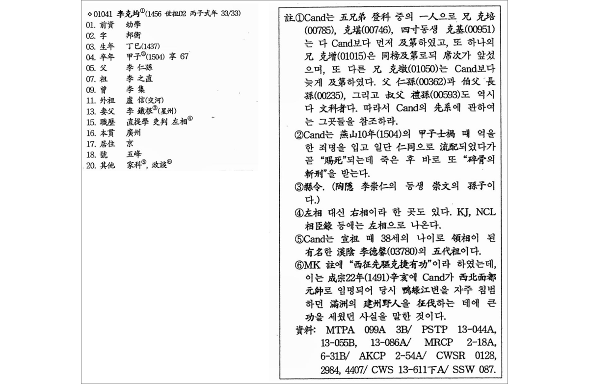 - The following is an English translation of the Wagner–Song Munkwa entry number 01041 for Yi Kŭkkyun (1437–1504). The entry makes extensive use of “Others” and “Notes” fields, supplemented by a heavily acronym-laden list of sources that form its evidentiary basis. While the kinship details are useful for individual searches, the database schema is not designed for multi-level or longitudinal analysis.