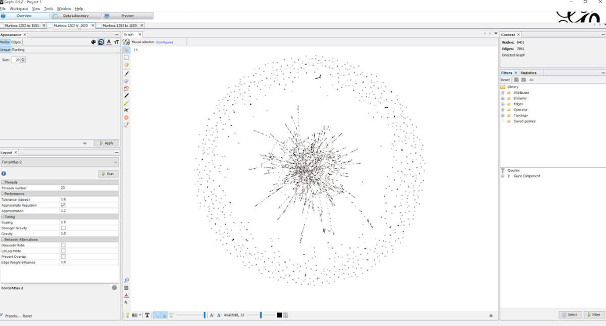 In 2010 and 2011, my participation in an Institute for Advanced Topics in the Digital Humanities workshop on “Networks and Network Analysis for the Humanities” provided both the opportunity and motivation to preprocess a preliminary dataset of examination candidates who received degrees between 1393 and 1469, along with their kin, into Cytoscape for visualization.12 In a dataset containing 3,793 edges and 4,057 nodes, Cytoscape’s force-directed layout algorithm revealed a giant component with 2,040 edges and 1,936 nodes, alongside dozens of subnetworks (see Figure 9). Further visualization attempts in later years, using datasets covering different time periods and incorporating custom datasets created by other researchers, yielded similar results. Figure 10 illustrates the Wagner–Song data for 1502–1609 in Gephi, while Figure 12 presents a panorama of the “whole” network, a structure dubbed the “Eye of Munkwa,” constructed using Lee Jaeok’s Chosŏn civil examination data for 1393–1894, encompassing 47,293 nodes and 49,808 edges.