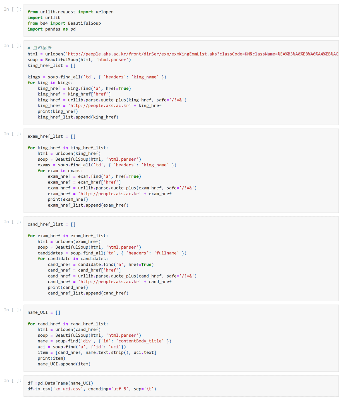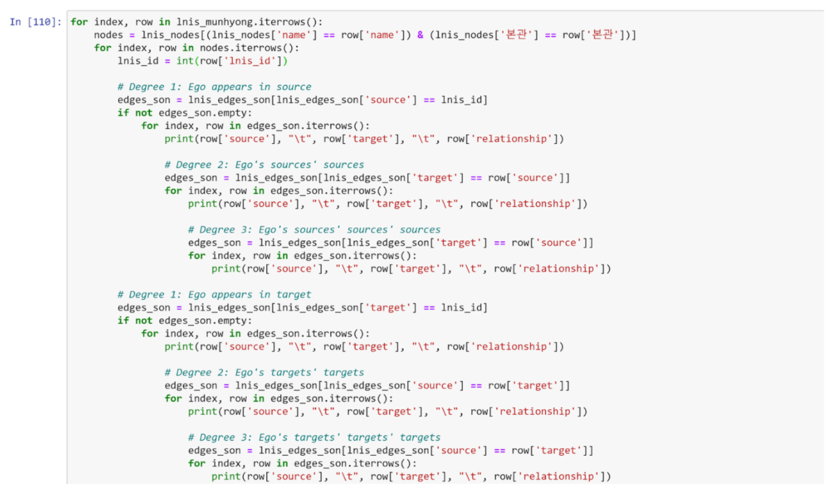 The first step in this process is data extraction, which varies according to how the data sources are formatted. AKS provides biographical and examination data in XML, but the UCI for each entry is available only on its online platform, which requires web scraping. Lee Jaeok’s scholarly editions of examination and genealogical data are published in Excel, whereas the Lineage Network Information System dataset is available in JSON. Filtering tabular data by dynastic period, such as early Koryŏ, late Koryŏ, or mid-Chosŏn, or by index years, birth years, or death years facilitates the selection of relevant records. Using this method, I isolated 35 percent of biographical entries and 18 percent of conferred degrees that fall in the range of 900 to 1600. Genealogical records, however, pose greater challenges. Most entries contain only given names and choronyms, making it necessary to run a Python script with nested loops to identify kinship ties within three generations of each notable individual or examination candidate (Figure 13).