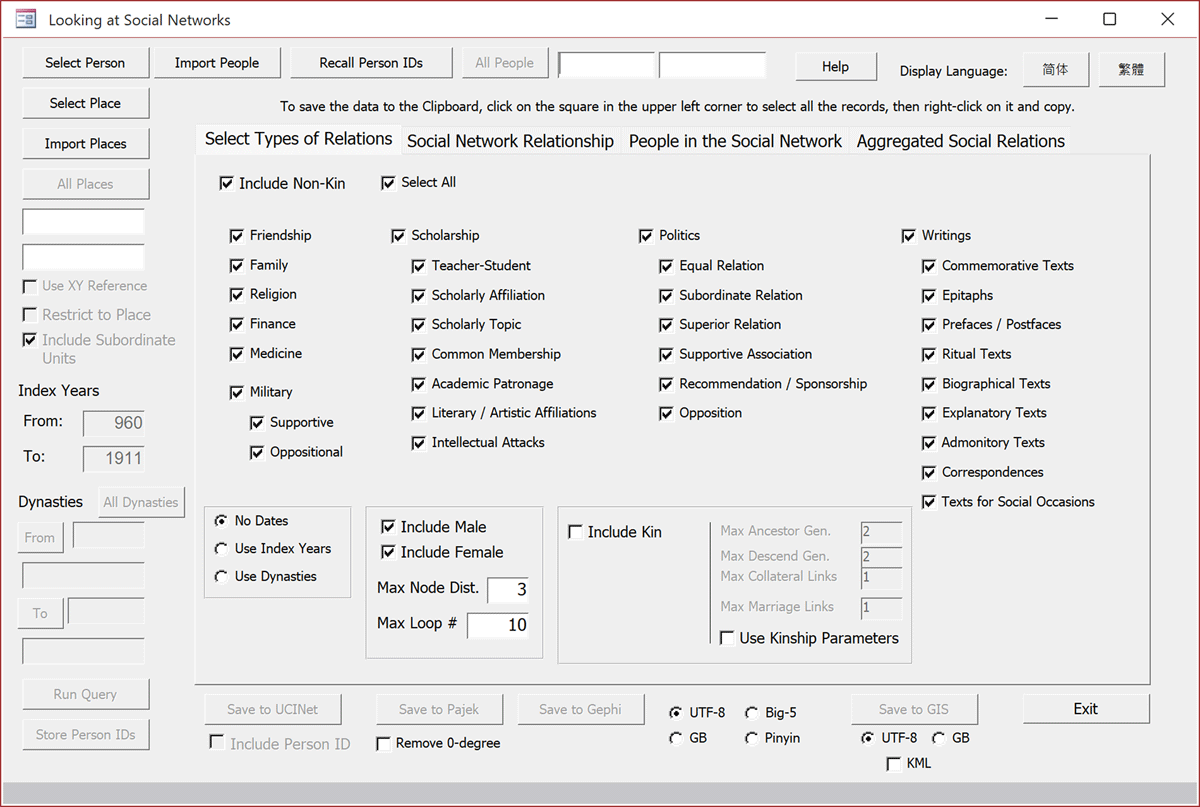 The Medieval Yangban Project stores all nodes and edges as graph data using Neo4j’s native support for index-free adjacency. This makes it possible to begin with a telephoto view of an individual examination candidate or political faction and then zoom out to a wide-angle perspective of adjacent entities and regions without breaking continuity. The distinction becomes clear when compared to non-graph based solutions, such as the social network lookup applet for the China Biographical Database built in Visual Basic for Microsoft Access (Figure 14). That system requires the user to select an individual by unique identifier and trigger a series of SQL queries to retrieve relational connections through loops, with results exported to UCINet, Pajek, or Gephi for visualization. By contrast, the Medieval Yangban Project performs such queries only once, during preprocessing and import, and embeds kinship and social ties directly into the database. As a result, tracing the extended network of, for example, the fifteenth-century scholar Kim Chongjik (1431–1492) does not require runtime SQL outer joins; rather, his kinship and political ties are already baked into the Neo4j database. Examples like this point to the larger promise of the project: to show how individual careers and family strategies, once pieced together, help illuminate the broader processes of aristocratic formation in medieval Korea (Figure 15).