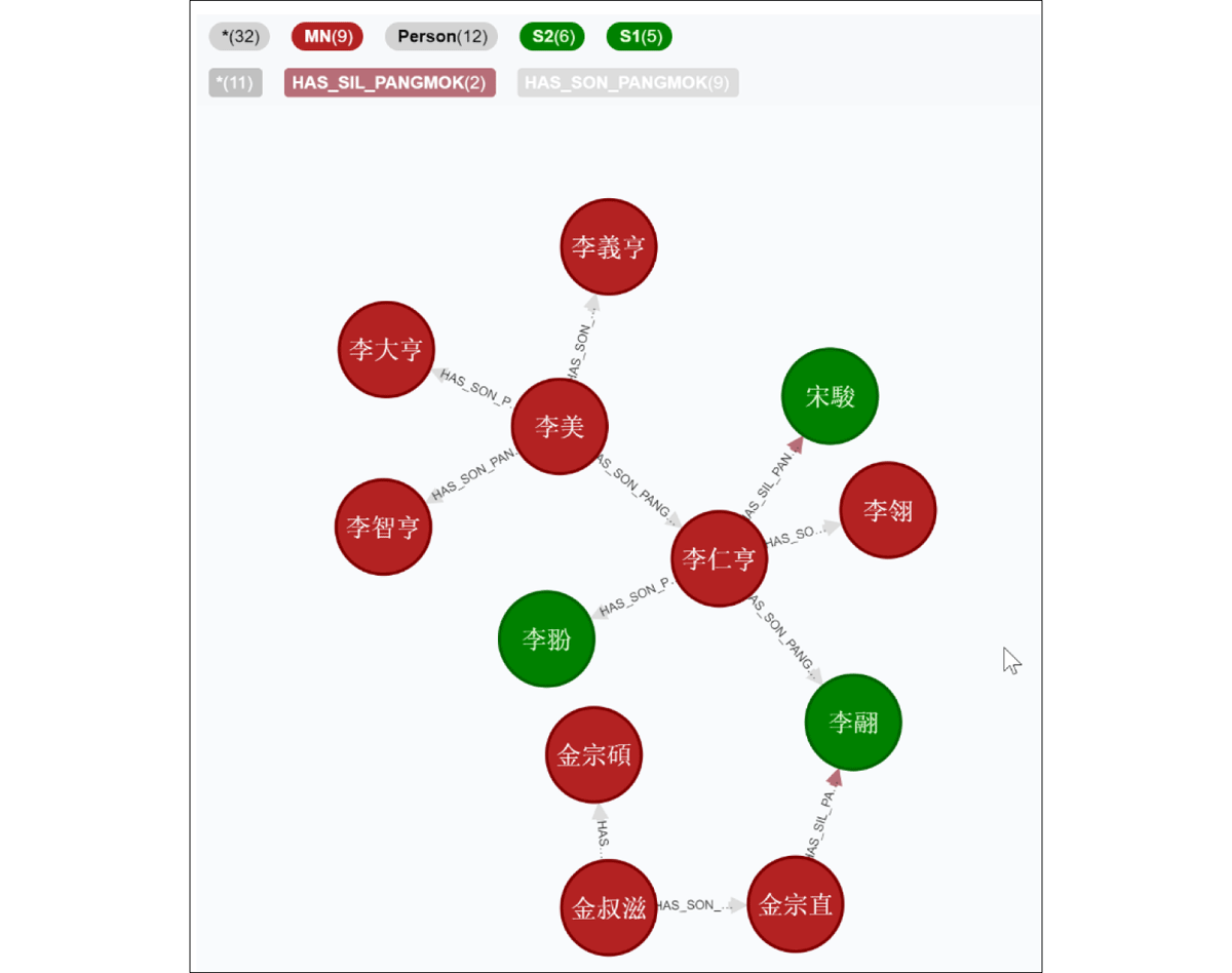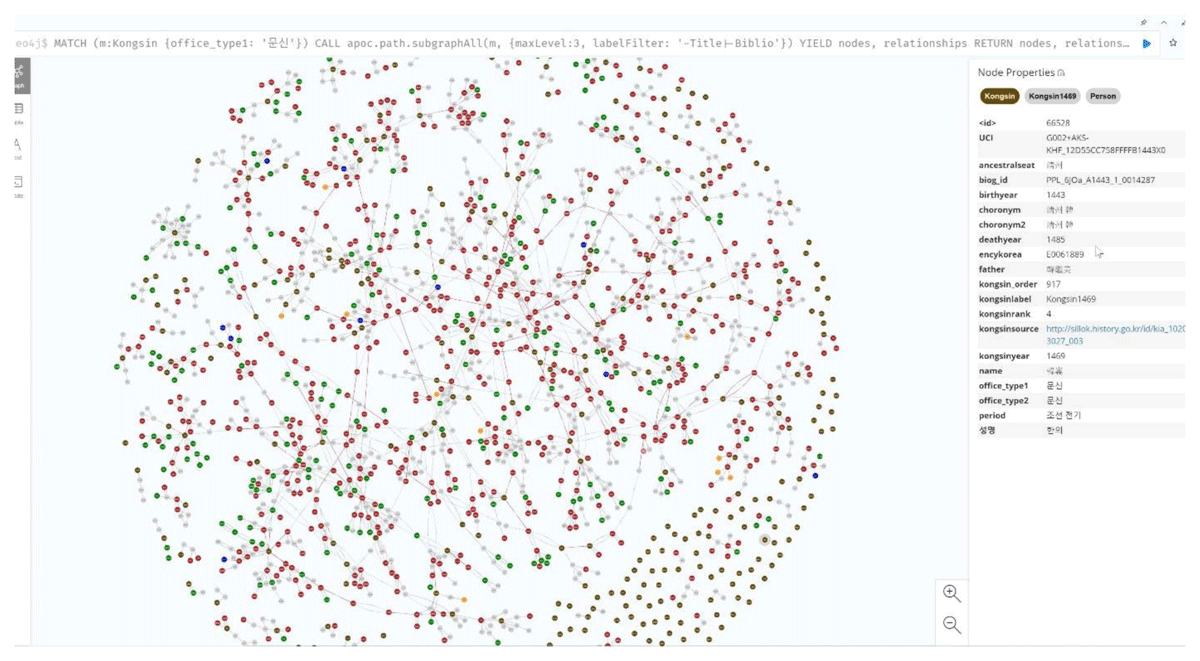 To push Neo4j’s capabilities further, I added new datasets tailored to additional research questions. These include 1,097 merit subjects who received investiture between 1327 and 1589, 370 collected works, and 4,487 individuals referenced in the Annals of the Chosŏn Dynasty. The merit subject dataset is especially useful for countering the common but misleading impression shaped by the historiography that this institution mattered only in the fifteenth century. The collected works dataset, by contrast, helps identify figures whose writings have survived. As present, the database contains 44,268 nodes with 39 labels—about twenty of which function as categories rather than entities—and 23,090 relationships of 29 types (Figure 17).