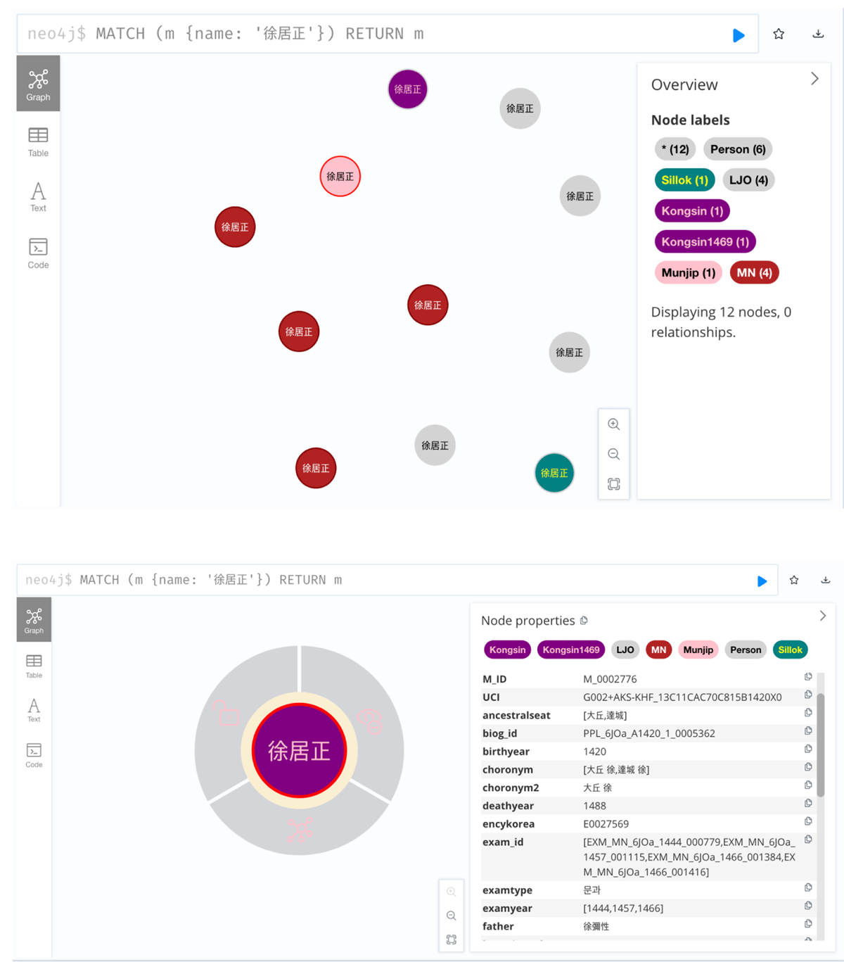 Once the data are extracted, the next step is to bring them into Neo4j in bulk, where I label nodes, establish relationships, merge duplicates, and resolve ambiguities. The Medieval Yangban Project uses Neo4j’s labeling feature to represent people, titles, and sources, while the relationships record social, kinship, semantic, and bibliographic connections. Every individual is labeled as a “Person,” but those who appear in the AKS exam database carry an additional tag that specifies their exam type. Lee Jaeok’s dataset and genealogical sources are treated in a similar fashion so that their provenance is always clear. Inevitably, the import process produces duplicate records and overlapping relationships, which makes it crucial to have a method for unifying them. Yet this is more than a matter of routine de-duplication. It also demands thinking carefully about the very different ways relational and graph databases handle entities and linkage.