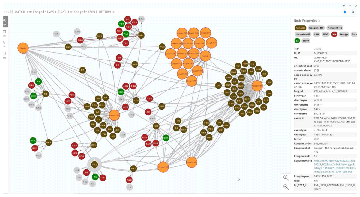 With the Neo4j macroscope in place, I returned to Edward Wagner’s classic research on the hereditary links of merit subjects across generations. In a 1974 study, Wagner challenged the common belief that the sixteenth-century reformer Cho Kwangjo (1482–1519) was a political outsider. He showed instead that Cho belonged firmly to the capital-based elite, tracing his lineage back to Cho On (1347–1417), who had received merit subject investiture for supporting the regime change of 1392 (Wagner, Literati Purges 80). Cho’s case is illuminating, but one example alone can only take us so far in understanding the broader sociopolitical structures of late medieval Korea. To test Neo4j’s potential, I turned to a question that historiography has largely passed over. Using a Cypher query, I identified all instances where the merit subjects of 1469 and 1589 were connected within two node distances (Figure 18). The reasoning here is simple: in Korean historiography, the merit subjects of 1469 have received sustained attention, while those of 1589 remain obscure. The clarity of the output owed much to the use of node labels and category nodes for merit subjects and collected works, which made it possible to generate an abstracted view of their interconnections.