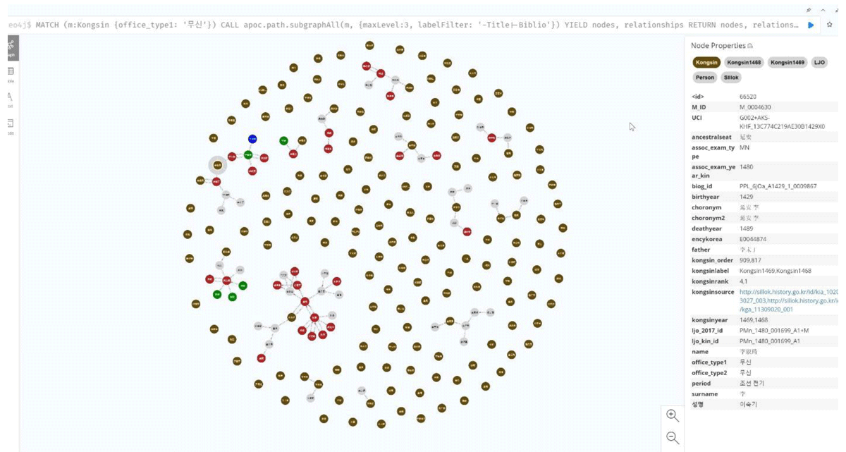 Among the various experimental queries conducted on the Medieval Yangban Project, some of the most significant findings emerged through an APOC procedure called apoc.path.subgraphAll(). This procedure traverses a network from a specified set of starting nodes and expands all subgraphs within a defined range. Figure 19 shows Neo4j returning all merit subjects with a military background, up to three degrees of separation. The results suggest that most either had no known descendants or were purged shortly after their investiture. By contrast, the equivalent query for civil officials (Figure 20) reveals a dense network of intergenerational and affinal connections, implying a stable and steady coalescence of some of them into a self-perpetuating hereditary clusters.