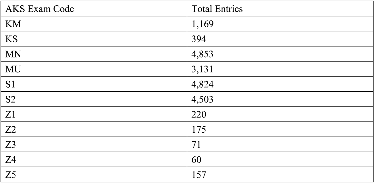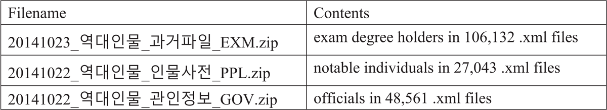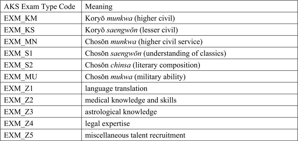 The core biographical data for the Medieval Yangban Project is drawn from The Comprehensive Information System for Korean Historical Figures (Han’guk yŏktae inmul chonghap sisŭt’em), an online platform maintained by AKS.7 Developed between 2005 and 2011 through multiple rounds of institutional funding from the National Information Society Agency (Academy of Korean Studies, “Han’guk yŏktae inmul”), this system consolidates three major repositories: (1) records of 108,392 degree holders of the civil, military, or technical state examinations, each tagged with a unique identifier and an exam type code indicating the qualification attained (Figures 2 and 3); (2) biographical data of 27,020 notable personalities; and (3) official registers of those who held government posts (Figure 2). These records, available as XML files, can be accessed through the South Korean government’s Open Data Portal.