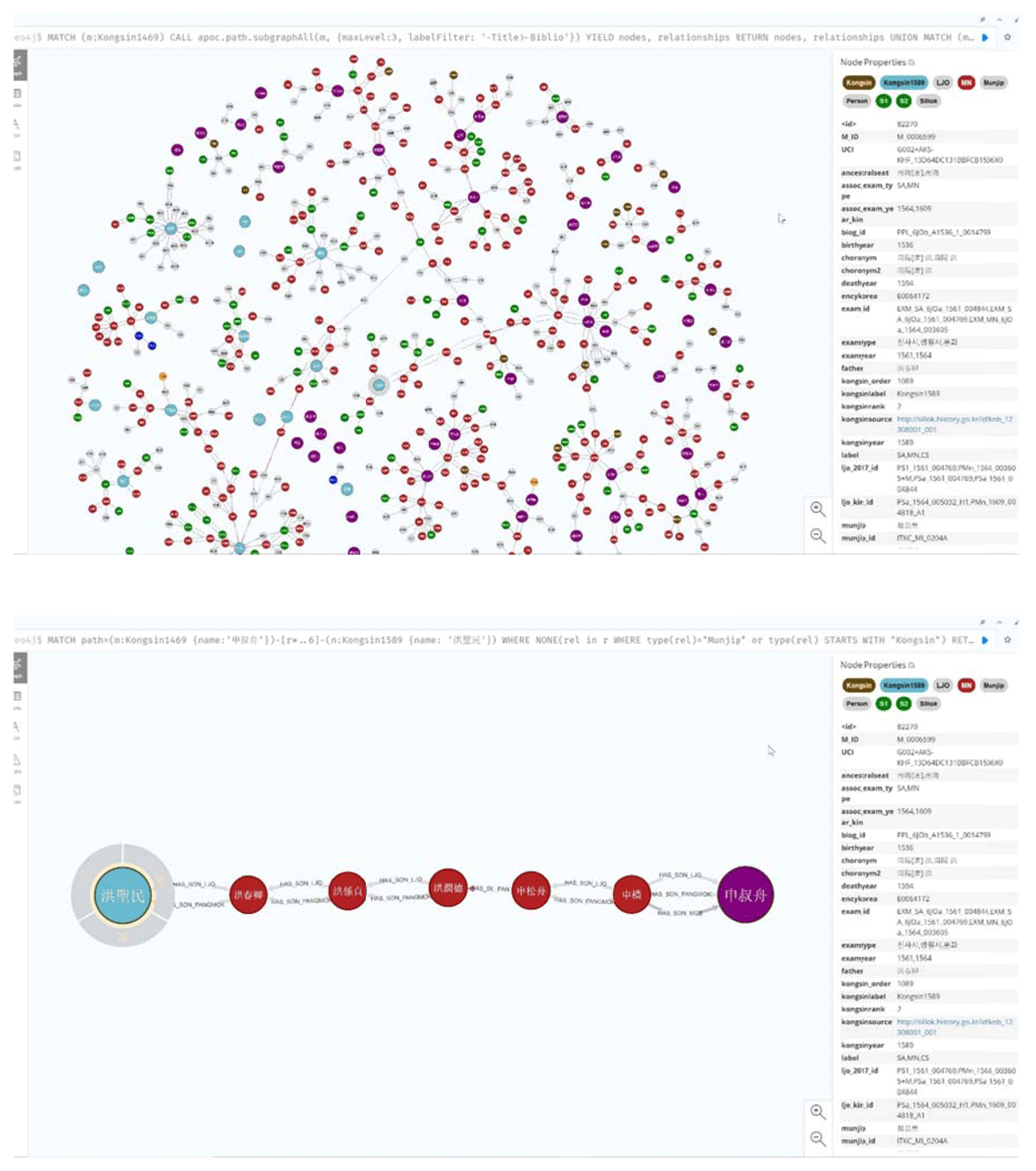 The apoc.path.subgraphAll() procedure makes it possible to move from the abstracted view in Figure 18 to a decomposed view of the merit subjects of 1469 and 1589, revealing details that would otherwise remain hidden. In Figure 20, for example, multiple chains of kinship ties stretch across numerous nodes. One connection in particular stood out: the long chain linking Sin Sukchu (1417–1475) and Hong Sŏngmin (1536–1594). To look more closely, I ran a targeted Cypher query focused on this relationship (Figure 21). What emerges is that density here does not necessarily signal centrality, but it does reliability. The father–son tie between Sin Chang (1382–1433) and Sin Sukchu, for instance, is corroborated by multiple sources, including the AKS examination database, Lee Jaeok’s research edition, and A Genealogy of Myriad Clans. By contrast, the affinal link between Sin Songju (1429–1503) and Hong Yundŏk (dates unknown) appears only in the AKS examination data—a reminder that even seemingly straightforward connections may need careful verification.