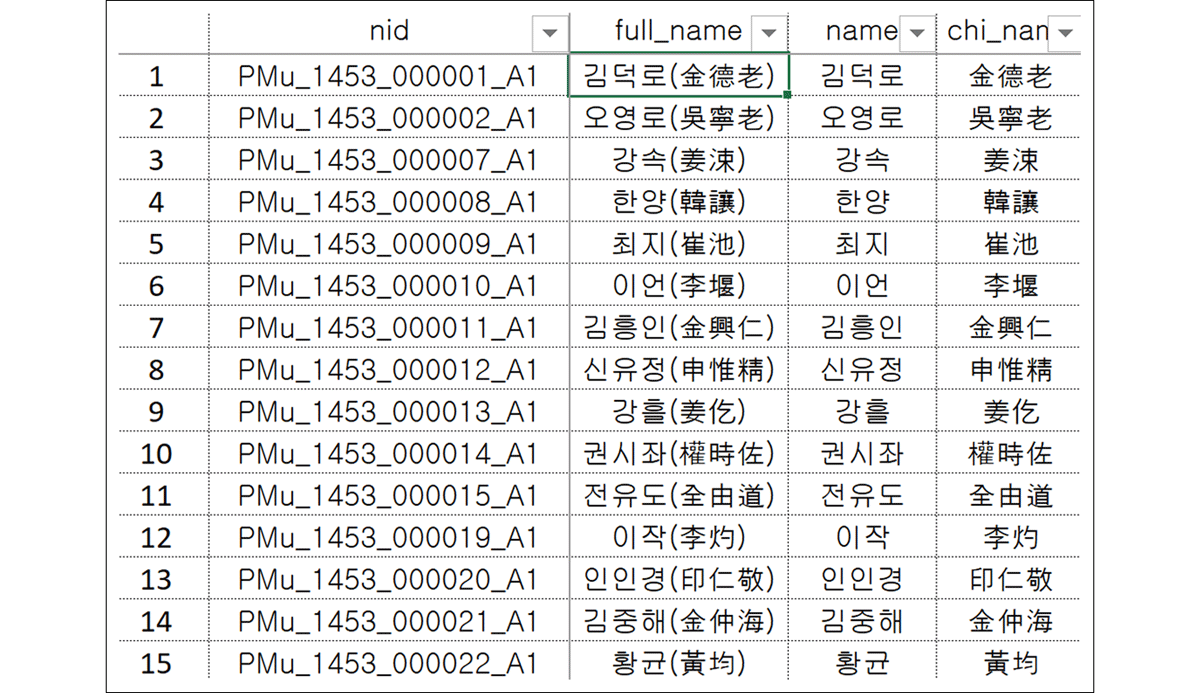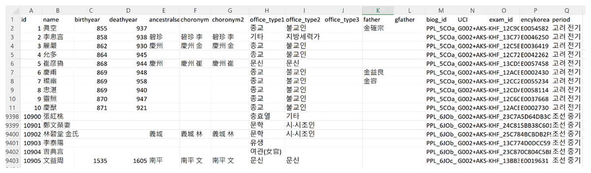 The Medieval Yangban Project also incorporates Lee Jaeok’s critical scholarly edition of the state examination database. Developed as part of his PhD dissertation, Lee’s customized and manually verified dataset enhances the official AKS database and resolves many of its inconsistencies.11 His edition assigns unique identifiers to individuals and uses suffixes to indicate kinship ties, such as father, grandfather, son, and brother. The dataset comprises both an earlier version and a later revision, and the Medieval Yangban Project references both. Legacy identifiers for degree holders begin with prefixes like “PMn,” “PSa,” and “PMu,” while kinship links are marked with suffixes such as “A1,” “A2,” “B1,” and “C1” (Figure 8). In his later revisions, Lee also aligned these records with genealogical data found in A Genealogy of Myriad Clans. In the next section, I show how I build on his meticulous work by linking individuals across multiple sources, resolving discrepancies, and reconstructing historical networks with the highest possible level of accuracy and reliability.