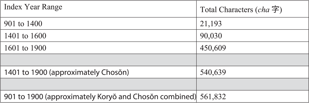 Not all records from the aforementioned datasets serve the aims of the Medieval Yangban Project. Only materials pertaining to yangban lineages, state examination candidates, and officeholders are included. The project examines the period from 900 to 1600, spanning the Koryŏ dynasty (918–1392) and the first two centuries of Chosŏn (1392–1910). The survival of sources from this era was significantly shaped by two major events. The first was the dynastic change from Koryŏ to Chosŏn in 1392, which brought sweeping reorganization and reinterpretation of official records. The second was the Imjin War (1592–1598), when many pre-1600 texts were lost or destroyed, leaving a thin documentary base for the study of both Koryŏ and early Chosŏn. The scale of this loss can be seen in A Comprehensive Compilation of Korean Collected Works (Han’guk munjip ch’onggan), which compiles the writings of 1,259 premodern authors. The five centuries corresponding to Koryŏ (c. 901–1400) yield only 21,193 Sinitic characters, while for Chosŏn scholars the figure jumps nearly twenty-five-fold to 540,639 for the period 1401 to 1900. The imprint of the Imjin War is also evident: before 1600, only 90,030 characters survive, or about 17 percent of the Chosŏn total, compared to 450,609 written after 1601 (Figure 5).8