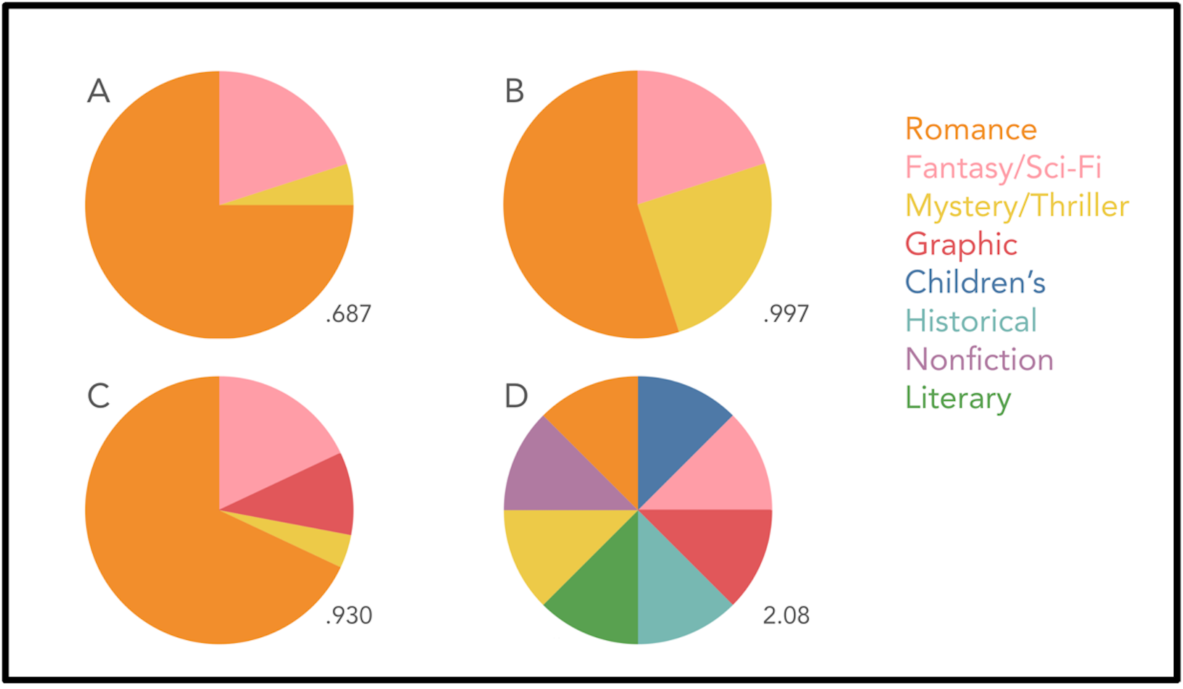 Something to bear in mind about this metric is that a reader who has read all three books just mentioned will have a lower Distance Score than a reader who has only read A is for Alibi and 50 Shades, even though their reading extends in both cases across the same maximum mystery-romance range. A different approach, which would count these users as equally eclectic, is to measure eclecticism using something called Shannon diversity. Widely used in studies of ecosystems and population genetics but a novel approach in the study of cultural consumption, the Shannon diversity index is a metric that attempts to gauge both the variety of categories in a set (the number of different kinds of thing) and the balance of things across the categories (the number of examples of each thing).14 In Figure 1, Reader A has read lots of Romance (in orange), some fantasy (in pink), and a little mystery (in yellow). This leads to a fairly low Shannon score of .687—low in this context, it should be said, since Shannon scores vary in magnitude depending on how many categories you’re measuring. Reader A can improve their Shannon score in two ways. They can read more of one of the genres in their small pie slices. In that case, they’d be like Reader B, whose reading is more balanced because of their greater mystery consumption, giving them a Shannon score of .997. Or they can do some reading in a new genre, like Reader C, whose enjoyment of graphic novels (in red) gives them a Shannon score of .930, even though they read the other genres at the same rate as Reader A. The most eclectic reader by this metric in our system of eight genres is Reader D, whose perfect balance among all the genres gives them a score of 2.08.