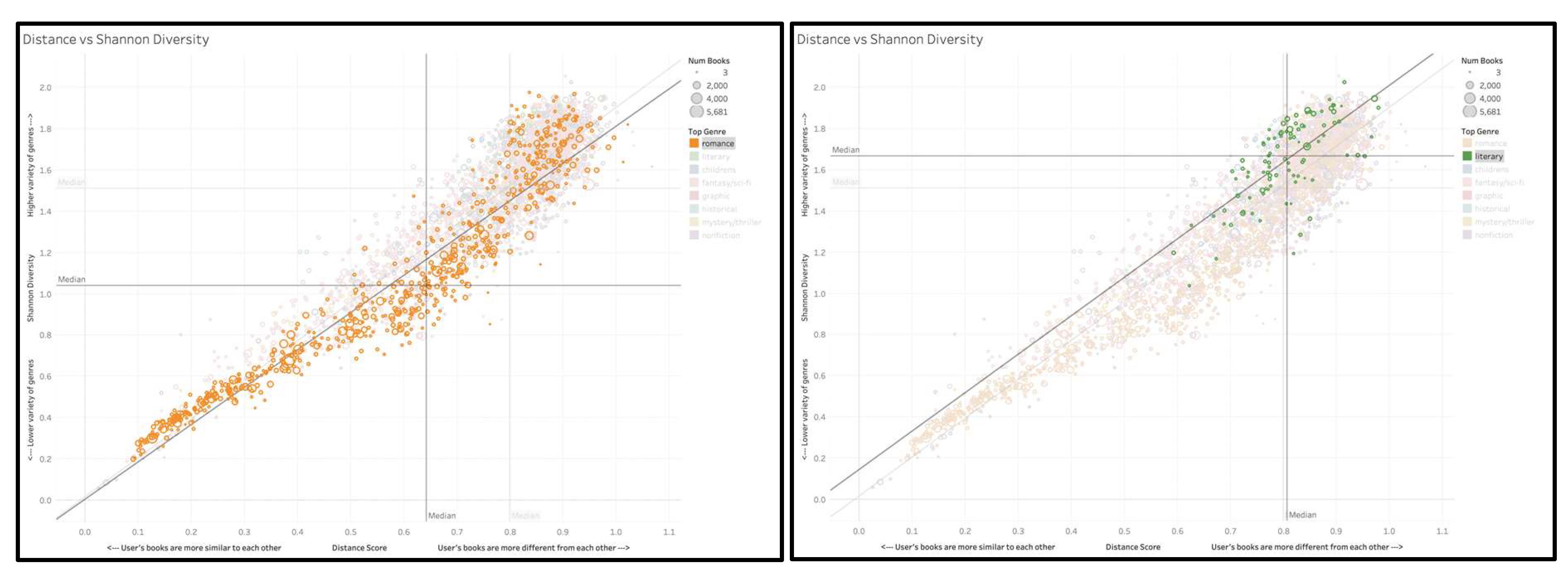 Figure 2 is a plot of our users by Distance Score (on the x axis) and Shannon Score (on the y axis). The sloping fit line tells us that the two figures are quite closely correlated. (In a linear regression, r2 = .87 and p < .0001.) That makes sense, since we used the same genre/shelf information to calculate them. Nevertheless, the two metrics still create meaningful space between our readers, and from this plot, a few generalizations can be drawn about the most and least eclectic users in our study. In the southwest quadrant, at the very low end of both the Shannon and Distance scales, we find a preponderance of readers (colored orange) whose most favored genre is romance (Figure 3). At the opposite, northeast corner of the scales, we see comparatively few romance readers, and a high fraction of the readers who favor literary fiction (green). Overall, as presented in Table 2, romance readers collectively have the lowest Distance Scores and the lowest Shannon Scores, while readers who favor literary fiction score the highest on Shannon and the second highest on Distance, just slightly behind readers of mystery/thriller.