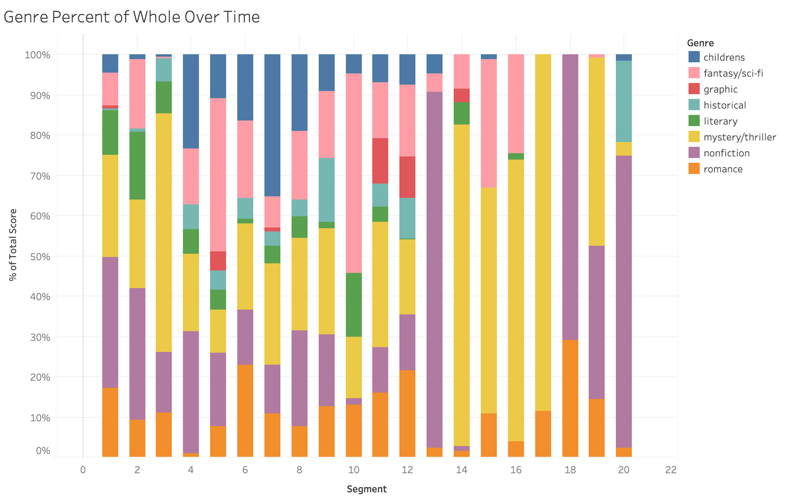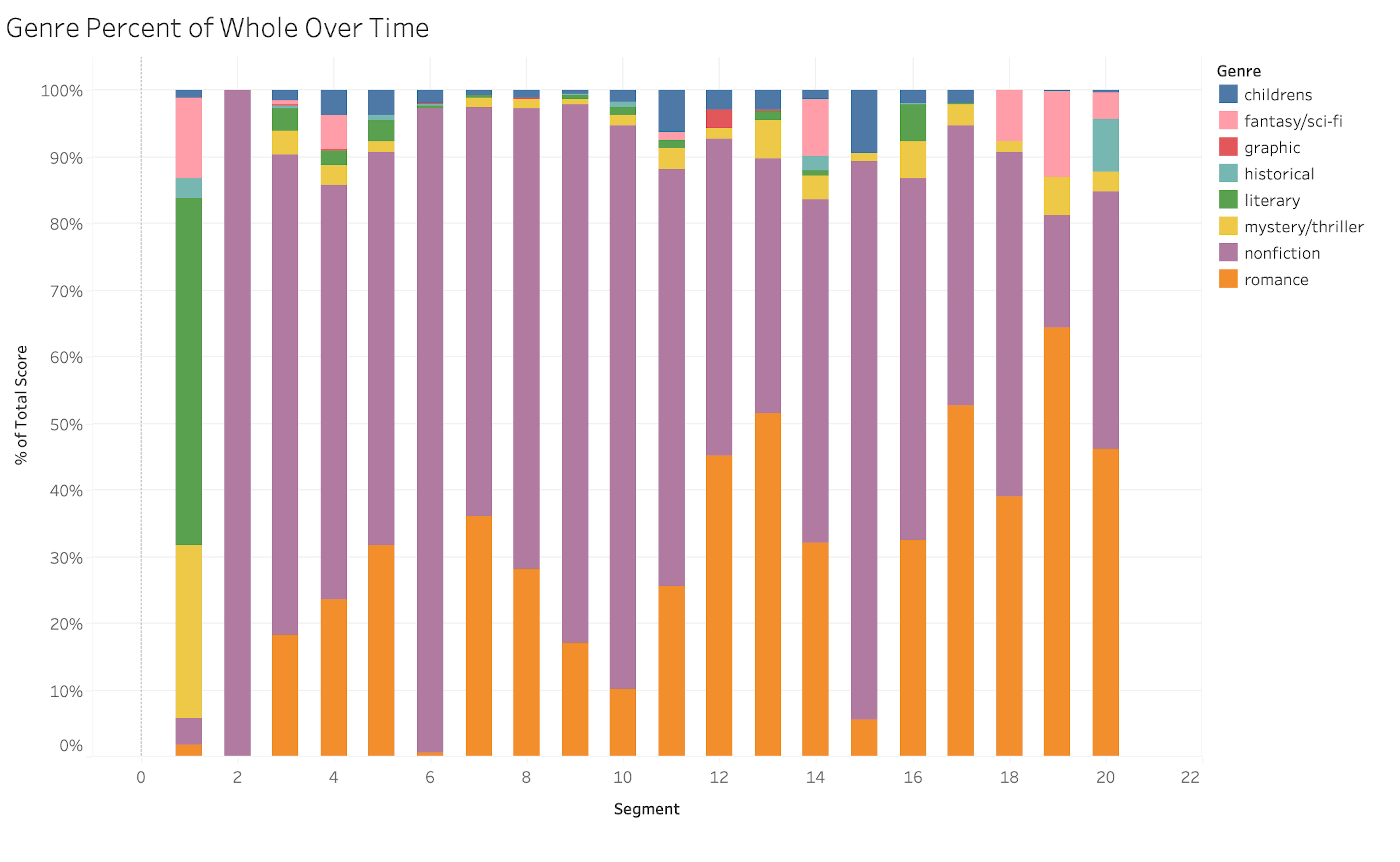 - We are visualizing the data in this alternative view because the books in this reader’s collection are distributed very unevenly over time and her preference for romance appears most starkly in the segments with the most books. If we used the same format as in Figures 6 to 9, the overall pattern would be obscured by the misleading visual equivalence of segments with 50 or 100 books and those with just a handful. ⮭