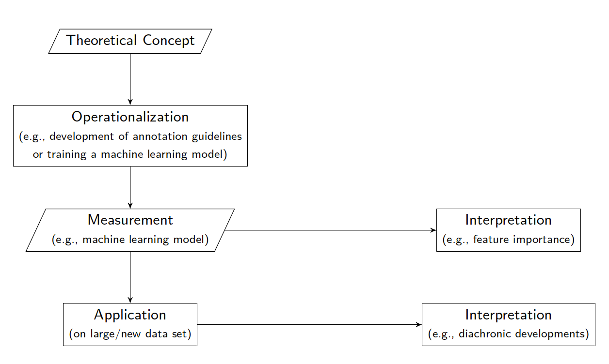 The process of developing methods to bridge this gap is called ‘operationalization’ and is the focus of this article. It consists of developing the necessary steps to unambiguously assign the instantiations of a concept to this very concept and thus measure it. Accordingly these steps can be used to detect the instantiations of the concept, allowing its subsequent quantification, manual inspection and/or downstream processing. Such an understanding of operationalization brings together the operationalization-practice from empirical sociology and digital humanities: While, as for example in Schnell et al., in sociology operationalization is understood as the development of an instruction for recognizing the observable instantiations of a theoretical concept, in digital humanities, following Moretti, it is often understood as the development of a rule for measurement.1