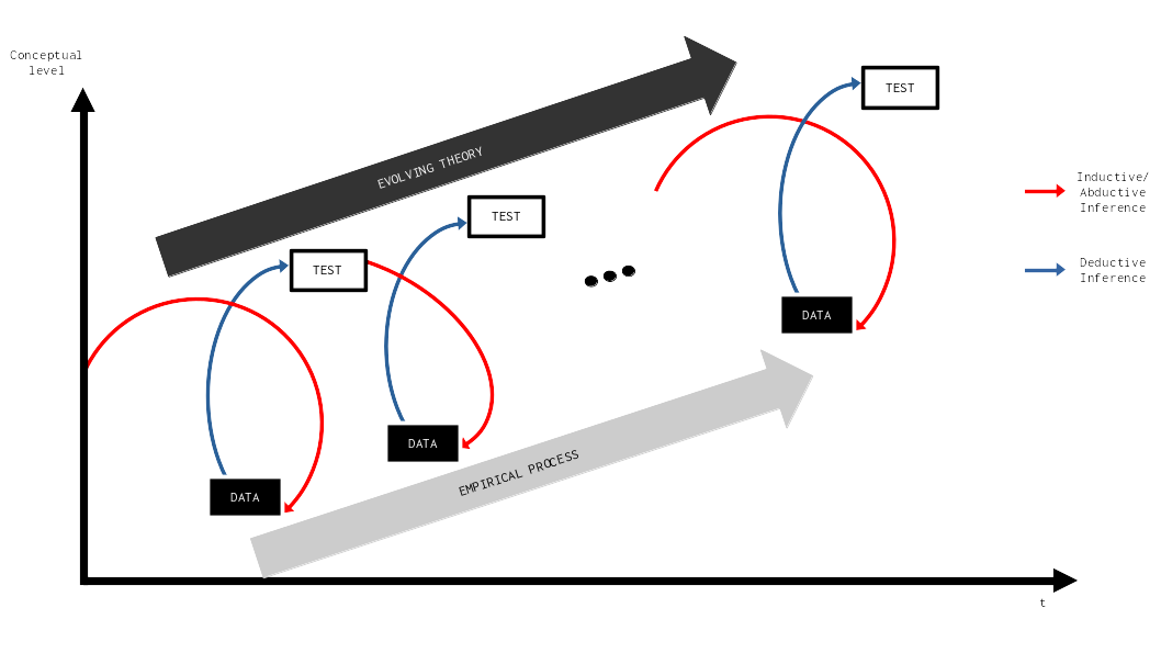 A continuous sequence of inductive and deductive steps, whereby data collection and hypothesis generation (inductive) is alternated with new, theory-driven data collection based on these hypotheses (deductive) and corresponding testing and elaboration of theoretical concepts. Thus, there is the need for a constant (re)integration of new knowledge within the initial research interest and project goals that allows for adjustments and explicit reflection on its implications.