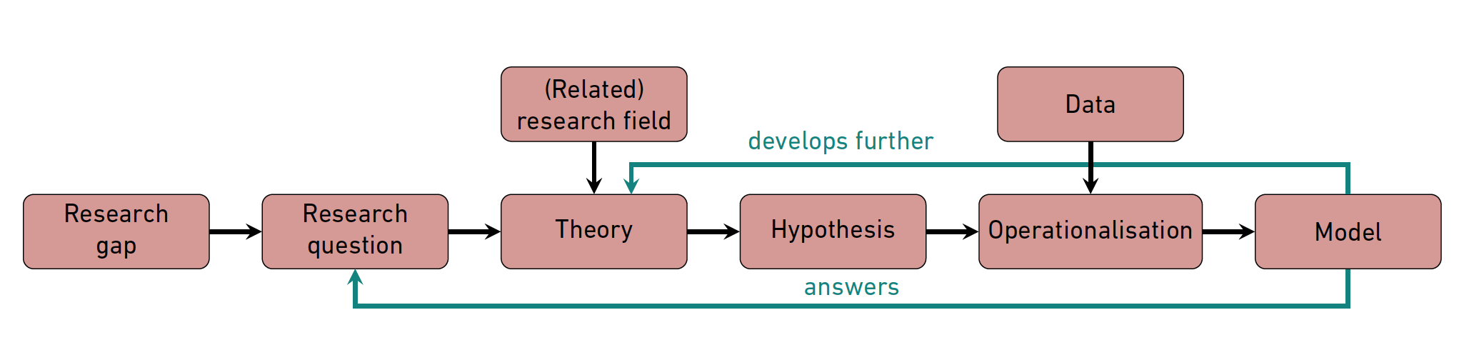 Operationalisation translates abstract concepts into measurable quantities, which can be included as variables in the statistical model. The result of the model indicates whether we reject or fail to reject the null hypothesis. Based on this finding, we can answer our initial research question and provide evidence or counterevidence for the theory. By testing a theory in different settings, we can falsify it, which helps to differentiate the theory further.