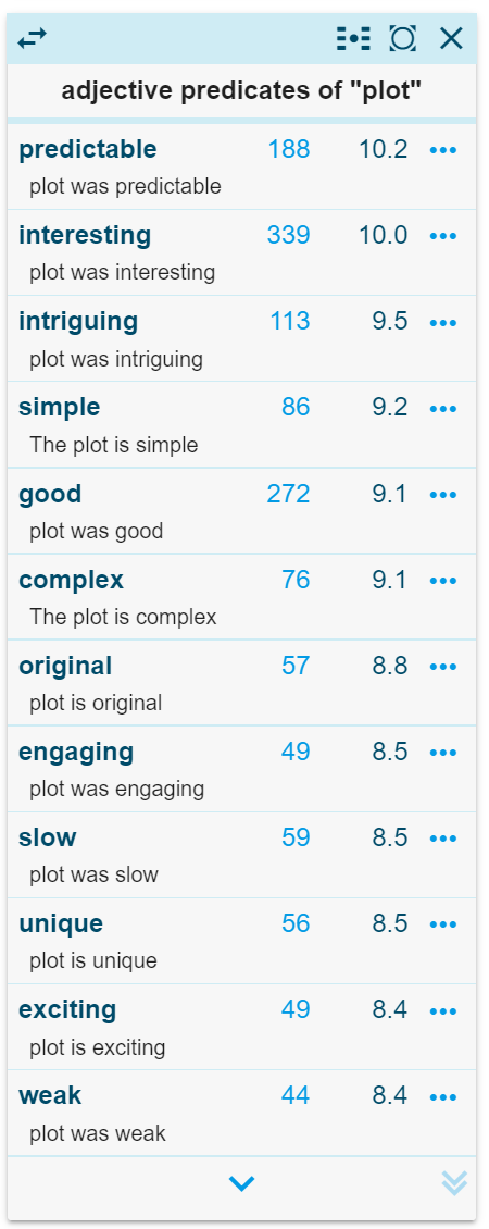 As explained above, a word sketch displays the collocates of ‘plot’ in several contexts (‘grammatical relations’, in Sketch Engine terminology). Figure 1 shows how Sketch Engine presents the adjectives most frequently associated with the word ‘plot’ in the Goodreads corpus,6 followed by the absolute frequency of the collocation and its (LogDice) typicality.7 These are words such as ‘predictable’, ‘interesting’ or ‘intriguing’ that we would indeed expect to be used with ‘plot’. Table 1 gives the full list of these adjectives. Some are mostly evaluative (‘excellent’, ‘awesome’, ‘bad’), some are mostly descriptive (‘twisty’, ‘straightforward’), others are evaluative as well as descriptive (‘predictable’, ‘compelling’, ‘confusing’). Many of the words do indeed imply a reading experience (‘intriguing’, ‘engaging’, ‘compelling’), and are necessarily subjective. But taken together, they provide a rich and balanced vocabulary for qualifying plots.