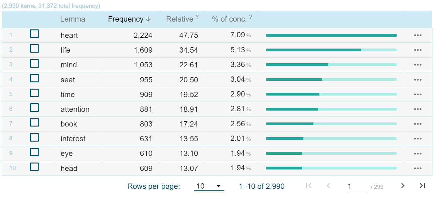 To look more systematically into the role of embodiment, we would like to search for references to body parts. While Sketch Engine does not know which words refer to body parts, we can find many examples of the body’s involvement in reading thanks to the fact that ‘you’ in book reviews usually refers to the reader. A search for ‘your’ followed by a noun brings up many relevant phrases. We can do this in Sketch Engine using the CQL option in the concordance tool, and then creating a frequency graph for the noun. The top results are shown in Figure 3. The most frequently occurring word in Figure 3 is ‘heart’. The context menu allows us to jump to a concordance of the phrase ‘your heart’. Then we find phrases from reviews such as ‘the book is going to break your heart (in the best way possible)’, ‘a great historical romance to warm your heart’, ‘deep moments, the ones that rip your heart out’, or ‘has your heart ever exploded with so much joy?’