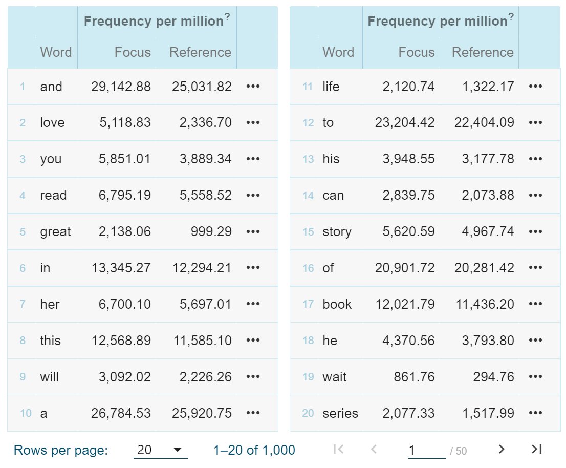 - After the first ten to twenty keywords, the differences in relative frequency quickly get so small that, while still statistically significant, it becomes hard to ascribe meaning to these differences. For the algorithm that Sketch Engine uses, see Adam Kilgarriff, “Simple maths for keywords.” Paper presented at the Corpus Linguistics Conference, 2009. ⮭