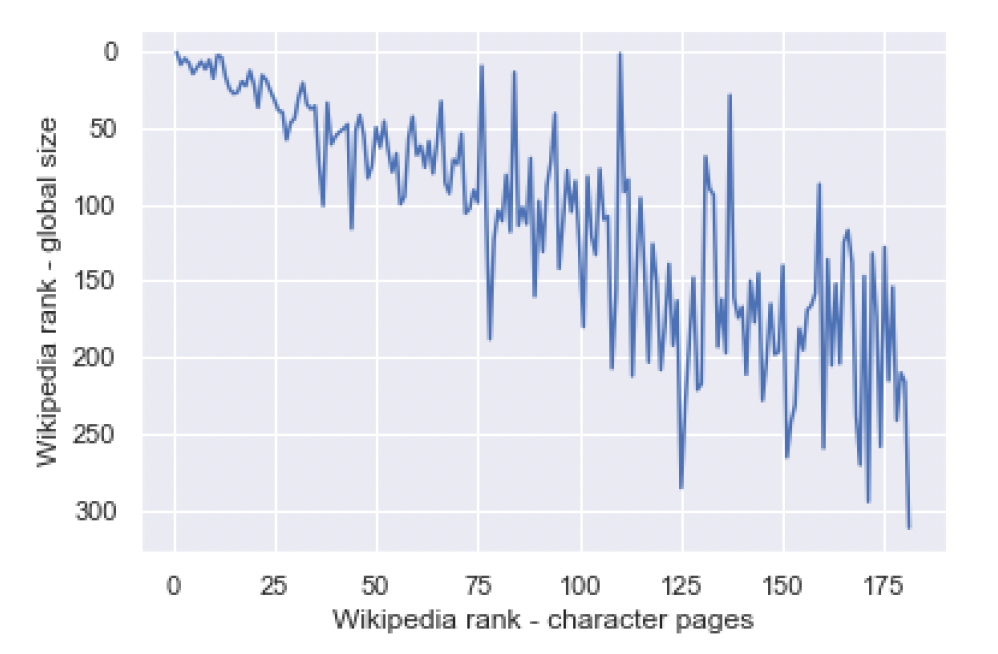 We removed characters appearing in the same top work as a higher ranked character (mainly characters from Harry Potter, e.g., Hermione Granger, Ron Weasley).
