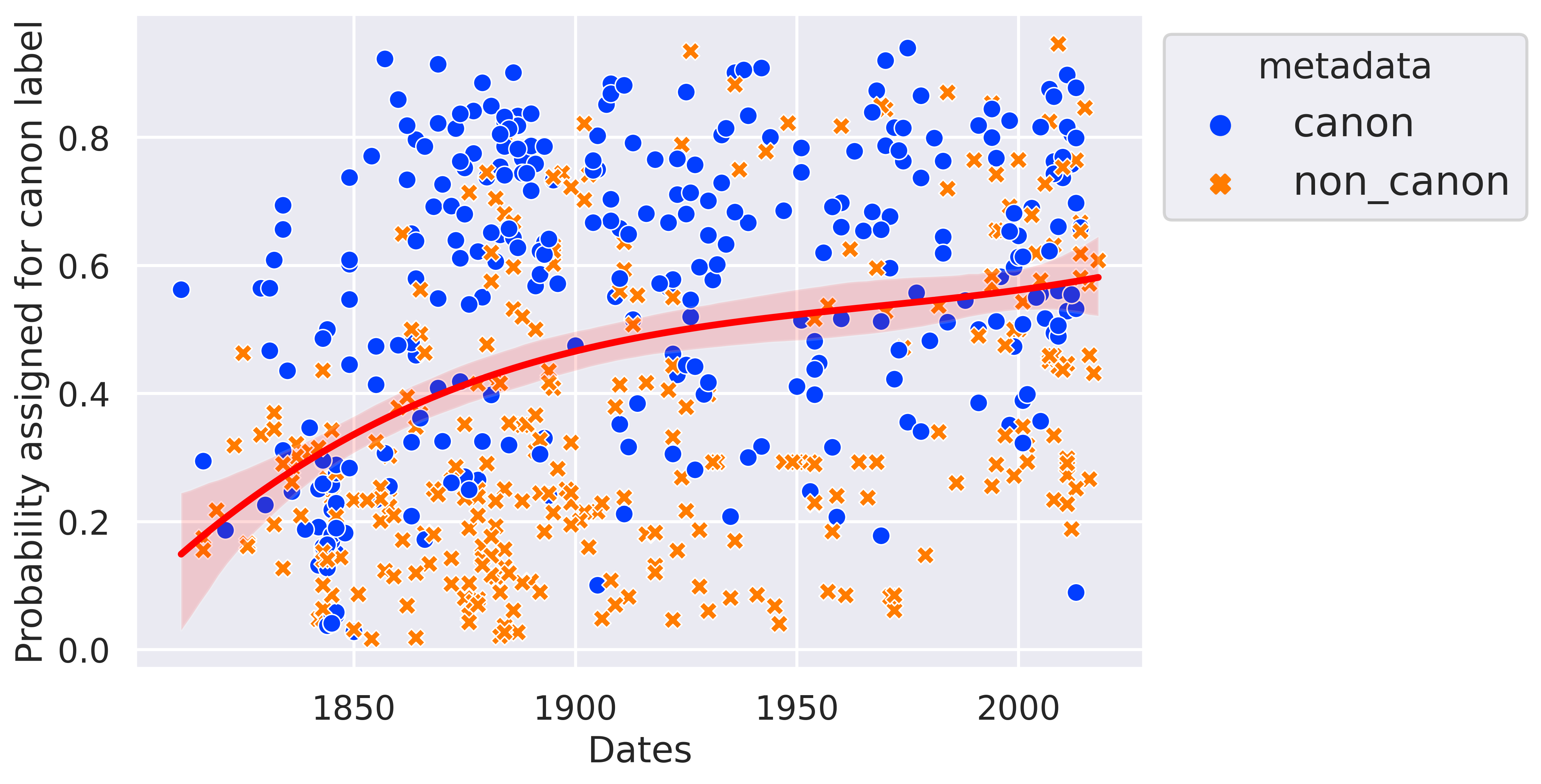 The red non-linear regression is fitted on the predicted probability for each text to be canonical. This prediction is retrieved from the test set, meaning that the model has seen neither the novel in question nor the writer’s other works. There is a huge increase in this probability over time, from 0.2 to 0.6 while it should be around 0.5 since our dataset is balanced. This result is discussed in the next section.