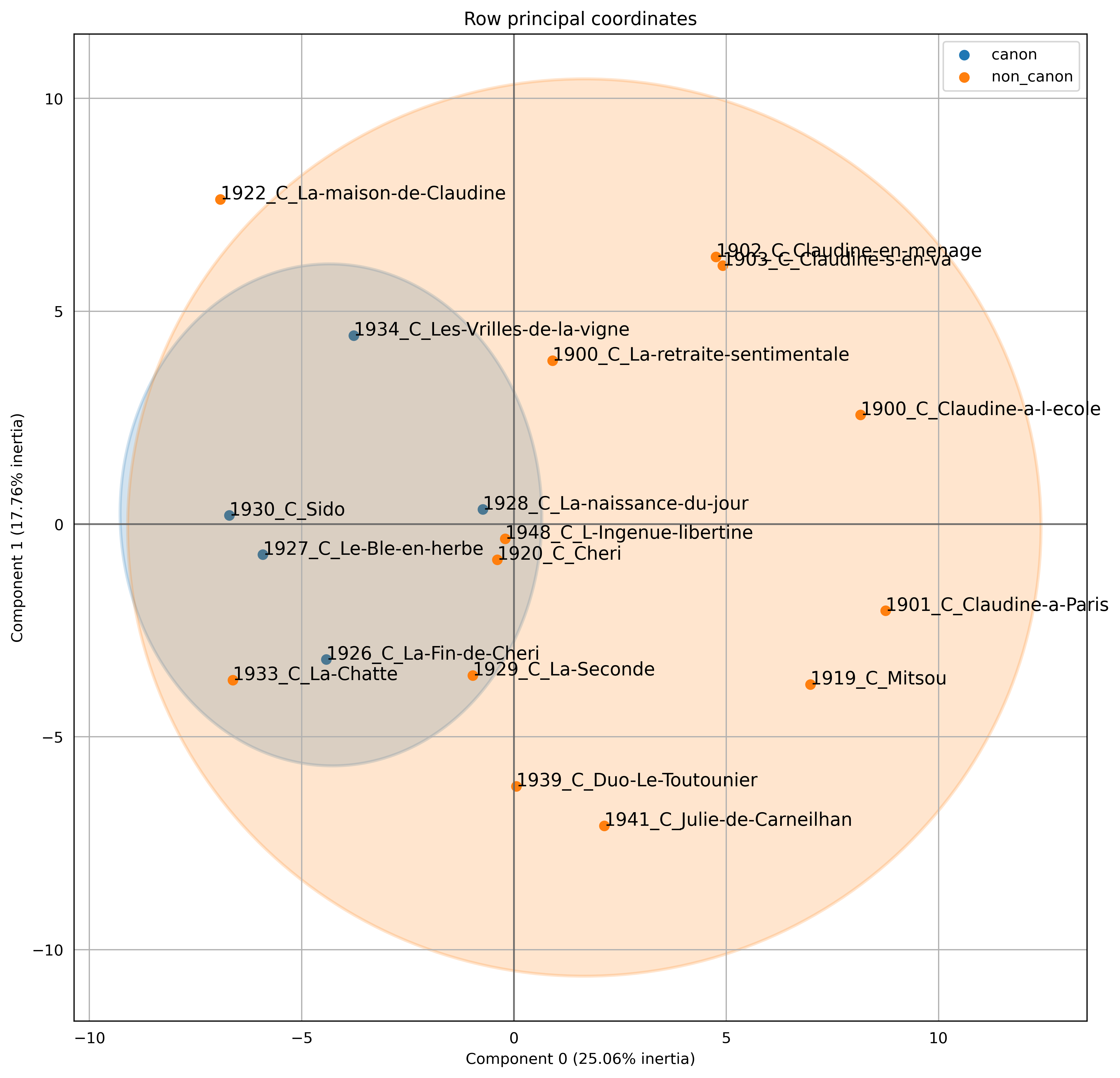 Figure 7 shows the PCA of the writings of Colette, a famous early 20th century writer. Two elements are highlighted in this graph, on the one hand in orange the non-canonical novels of Colette, and on the other hand in blue the works considered as canonical. The latter form a rather distinct group within Colette’s literary production. The PCA positions the canonical novels within a shared region of the graph, indicating a noticeable level of similarity among these works. It is worth noting that all five canonical novels were composed between 1926 and 1934. This temporal alignment might offer an explanation for their clustering, as it corresponds to a distinct literary phase in the author’s career. Far from this group is the series of Claudine, that were very popular novels which she published under her husband’s name. These novels made the popularity of the author at the beginning of her career, but did not correspond to the selection criteria of the canon. It was only later that Colette’s identity as a writer was firmly established (Ladimer), and that her works gained prestige. The novel Sido is a fictionalized memoir that delves into Colette’s relationship with her mother. Its placement within the canonical norm, and its departure from the Claudine series, reflects Colette’s transformation as a writer. The novel presents a more reflective and introspective side of Colette’s writing, as she contemplates her personal history, Note, however, that a late novel such as Julie de Carneilhan, published in 1941, is far from our canonical specificity, so the PCA does not only detect some chronolectal aspects of Colette’s work.