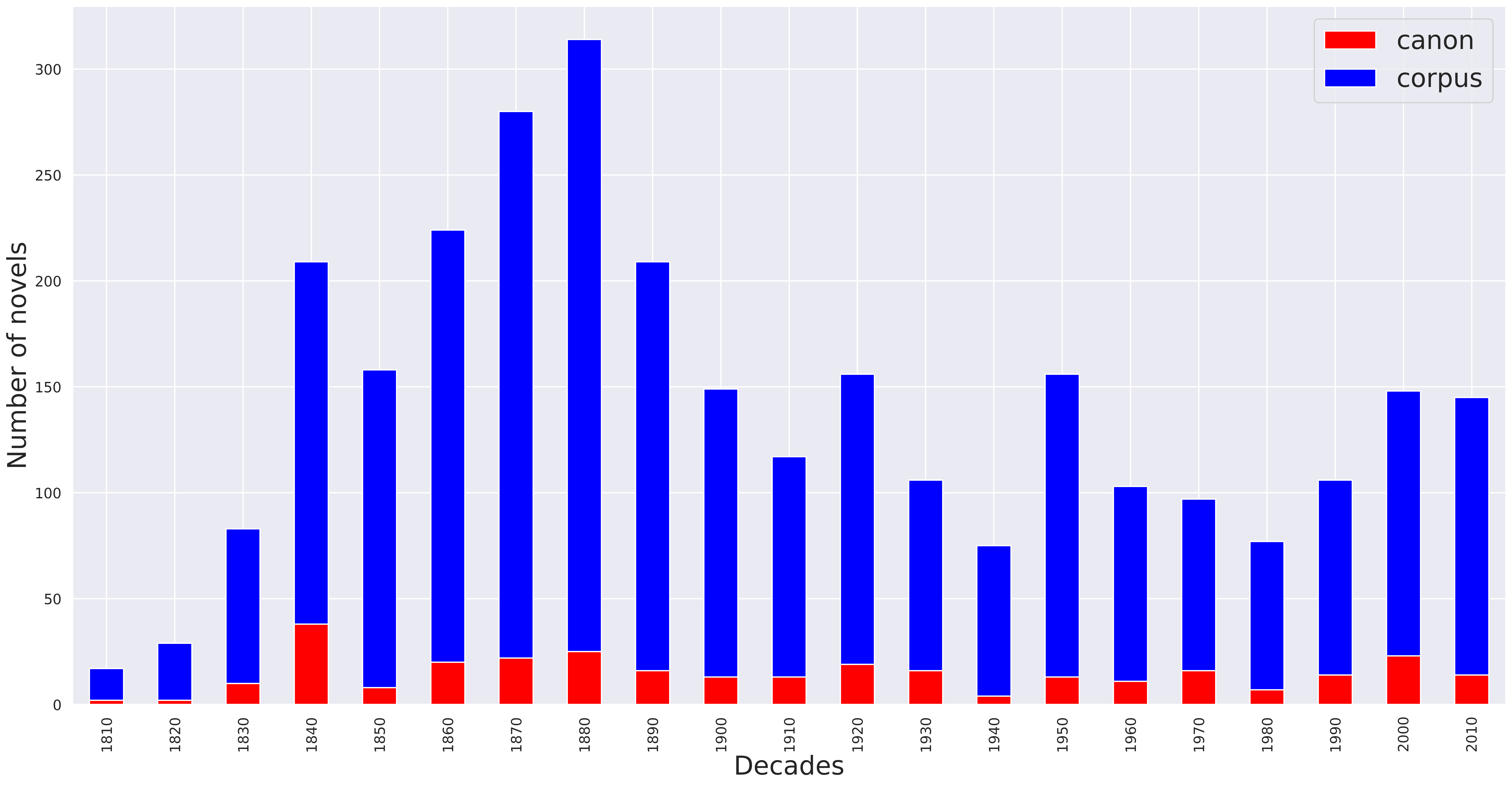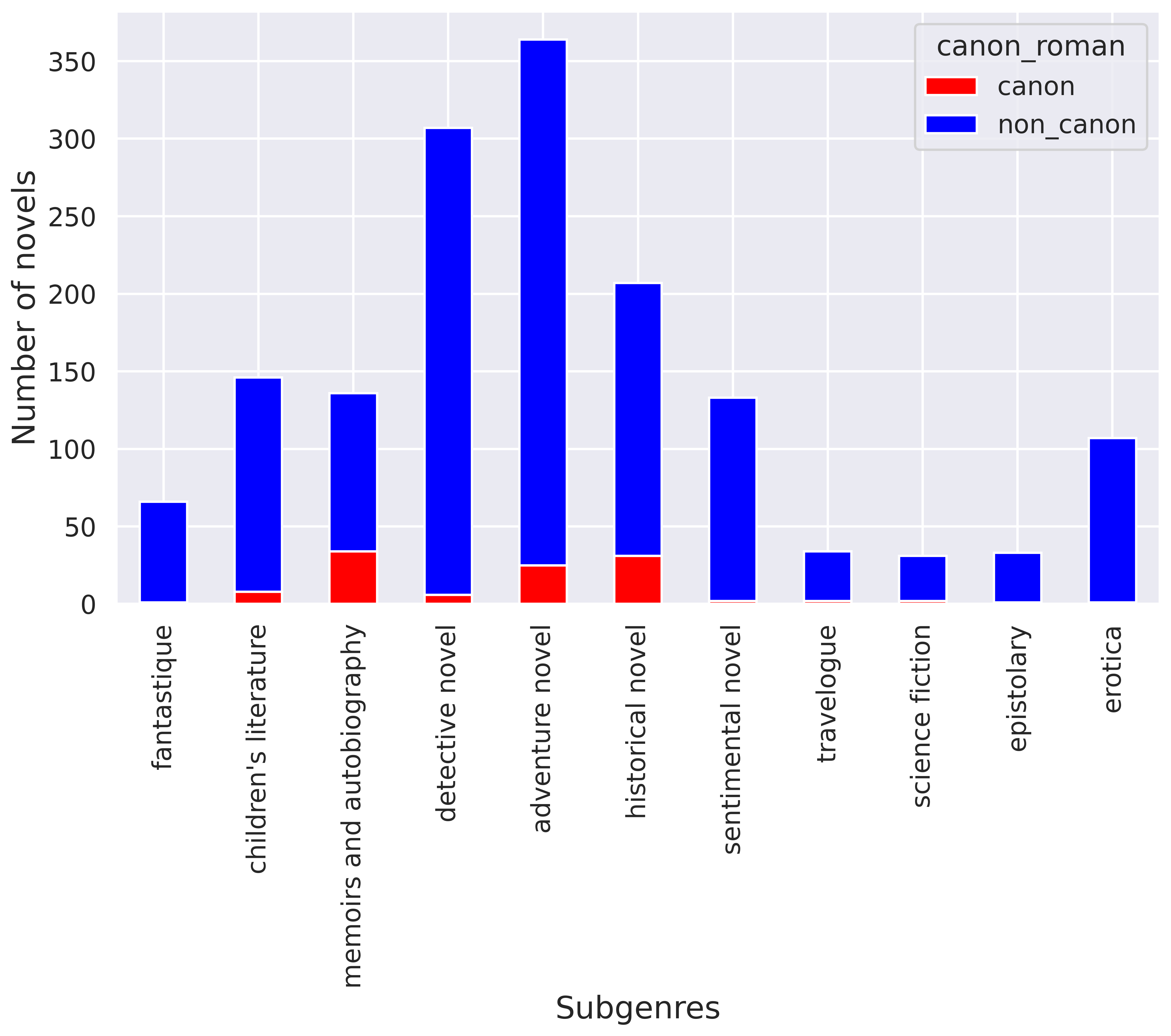 We believe that the non-canonical works in the corpus are a good sample of what the archive may have been, not only by their number – they account for nearly 90% of the novels at the novel scale, and 65% at the author scale – but also by the diversity of the sub-genres represented.