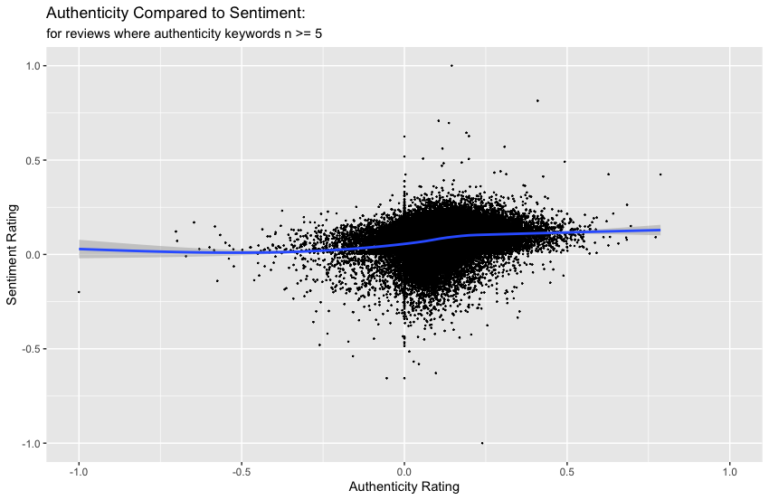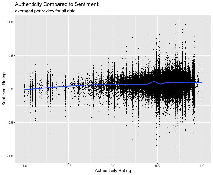 Sentiment was analyzed at the review level using a lexicon-based approach. Using the sentimentr package in R, I computed the sentiment of each review with the included “Jockers-Rinker” lexicon modified to remove all terms which also appeared in the authenticity lexicons (Rinker). The authenticity type lexica were also loaded into sentimentr and used to compute an authenticity score for each review reflecting the overall valence of the authenticity type terms present in the review. An advantage of using sentimentr for computing authenticity and sentiment scores is that it uses a rule-based approach to detect negation, downgraders, upgraders, and other lexical items which can contribute to or modify sentiment in the text. In addition, I approximated a general authenticity score for each review by taking the average of the authenticity subtype scores. To make the authenticity and sentiment scores more comparable, I rescaled all scores between 1 and -1. Finally, I used linear regressions to predict the relationship between authenticity score and sentiment.