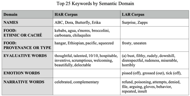 Finally, the two domains FOOD: ETHNIC OR CACHÉ and FOOD: PROVENANCE OR TYPE illustrate a clear overlap between previous findings concerning authenticity and social distinction and those of O’Connor et al. For example, frosty in LAR reviews is used to describe the drinks or glasses the drinks are served in and echoes the more explicit language found in the menus of less expensive restaurants. Keywords in this category from the HAR corpus on the other hand were associated with the provenance (pacific), preparation (squeezed) or type (hangar, Ethiopian) of food. In addition, specific dishes mentioned were mostly foreign or foreign sounding words, such as agua (fresca), chilaquiles, carbonara, or broccolini. These findings closely echo Jurafsky et al. who noted that the most expensive restaurants in their data focused on natural authenticity and used more complex and sophisticated language (Jurafsky et al., “Linguistic Markers”). This is also seen clearly in ex. 17, where there is considerable specificity in the description of the dish as well as a focus on the skill involved in the preparation of the dish. Scallops are not just cooked, but perfectly seared and silver dollar-sized, and they were not just served with broccolini but nestled on a bed of broccolini.