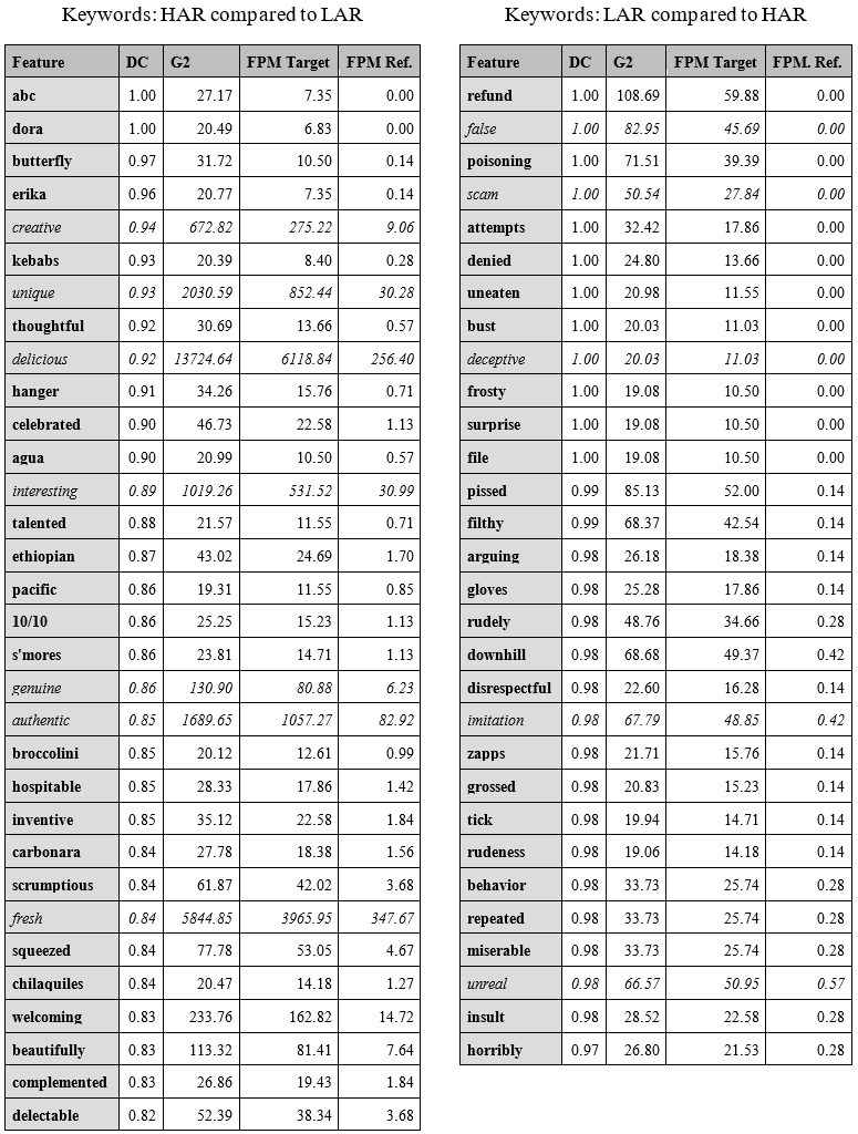 To begin, a “word sketch” of authentic in Sketch Engine was created for the entire corpus to gain a better sense of how the most explicit reference to authenticity was used in the data. Word Sketches are particularly useful for this type of initial investigation because the data is classified into subcategories such as “nouns modified by ‘authentic’” or “subjects of ‘be authentic’”. Unsurprisingly perhaps, the most frequent noun modified by authentic and the most common subject of be authentic was food. Other common subjects of be authentic include place and taste. After food, the most frequent nouns modified are restaurant, cuisine, dish, place, taco, pizza, flavor, experience and taste. Even at this early stage in the analysis, the presence of words such as cuisine and experience show the close relationship between authenticity and distinction, and indicate that consumers who style themselves as food connoisseurs expect to enjoy an ‘experience’ rather than just a meal (Mapes; Karrebæk and Maegaard). Likewise, cuisine and other synonyms for food (fare, cooking) which collocated strongly with authentic are distributed unevenly based on the authenticity score of reviews. All synonyms except for fare appeared more frequently in the HAR corpus than the LAR corpus. However the most pronounced difference was between the Germanic origin fare and the French cuisine in a manner echoing the register shift between French and Germanic origin English words noted in Mapes (281). In the HAR corpus the word cuisine (FPM = 25.9) appeared more than twice as frequently as fare (FPM = 10.63), while in reviews with the lowest authenticity scores cuisine (LAR FPM = 20.63) appeared less frequently than fare (LAR FPM = 22.51), as well as less frequently overall.