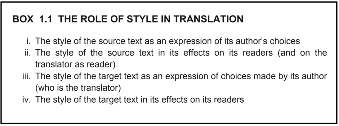 The aim of corpus-based studies of individual variation in translations is to investigate translator style. The concept of translator style has been extensively discussed in relation to translational stylistics (Baker, among others). Generally speaking, translator style refers to the individual writing and translating choices made by a translator when translating a text from one language to another. This can include decisions about word choice, sentence structure, cultural references, idioms and the overall tone and style of the translation. According to Newmark, translator style is “the individual way a translator expresses the message of the SL text in the TL version, which may be determined by his register, his culture and his personality” (54). Venuti (Translator’s Invisibility) expresses a similar opinion when he argues that the translator’s style is a reflection of his or her ideological, cultural and professional identities.