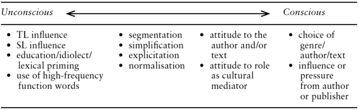 At the other end of this spectrum, TT-oriented studies of style focus entirely on the translated texts, usually by comparing features in two or more corpora of different translators without direct reference to the ST. Furthermore, Youdale (180) highlights some of the factors which can influence a translator’s style seen as points on a continuum of conscious vs unconscious elements of a translator’s style (see Figure 2). The nature of a continuum implies fuzzy distinction lines, and the author acknowledges this as he explains that “different aspects of style may be located at different points along the continuum, and these points themselves may vary from translator to translator and also vary over time” (Youdale 181).