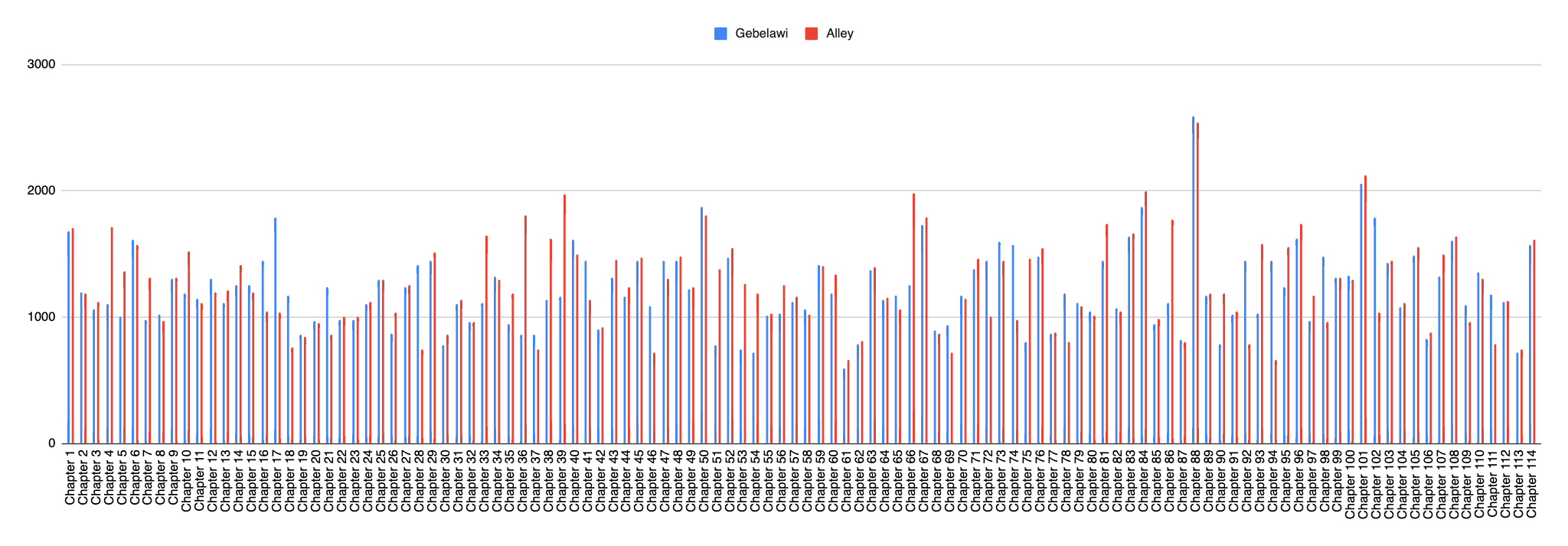 The analysis was also expanded to compare text length variation by Chapter as illustrated in Figure (3). The results show that Alley has more word count in 73 chapters (64%). Table (2) below also shows the results of a detailed word count analysis by Chapter.