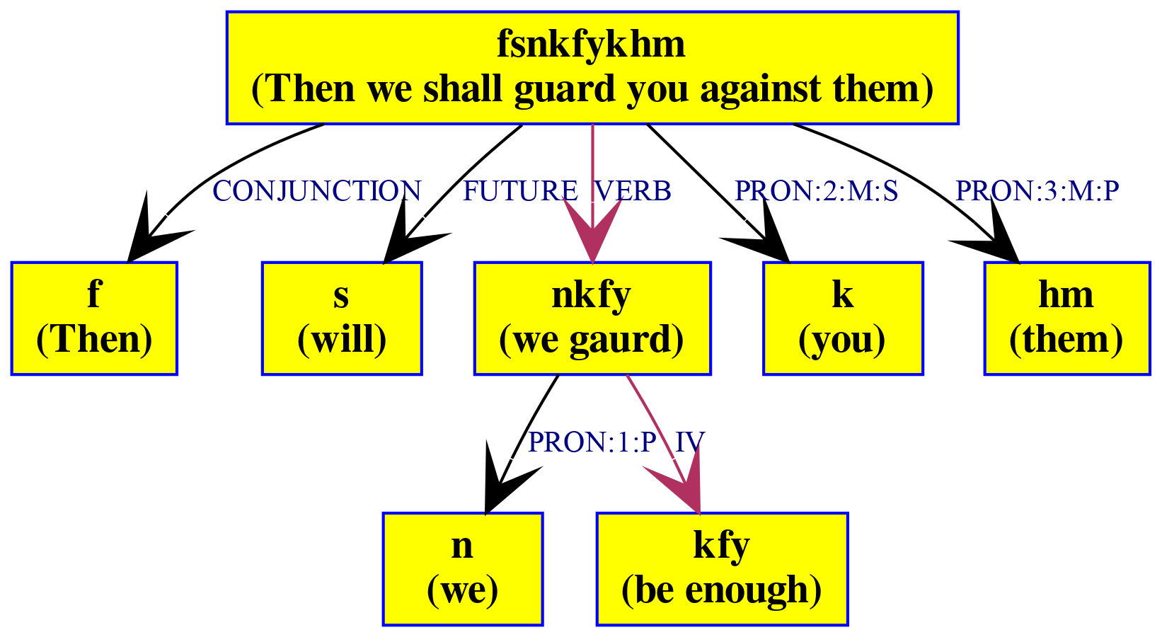 A white space-delimited unit in Arabic is usually made up of zero or more prefixes, a lexical item, and zero or more suffixes. Common prefixes are conjunctions, prepositions, and the definite article while common suffixes are possessive and object pronouns. For example, the orthographic unit fsykfykhm, depicted in Figure 3, is made up of the conjunction f, the future particle s, the verb ykfy, the direct object k and the indirect object hm. The verb itself is made up of the prefix n and the verb stem kfy. In most of what we do in this paper, we are mostly concerned with the stem.