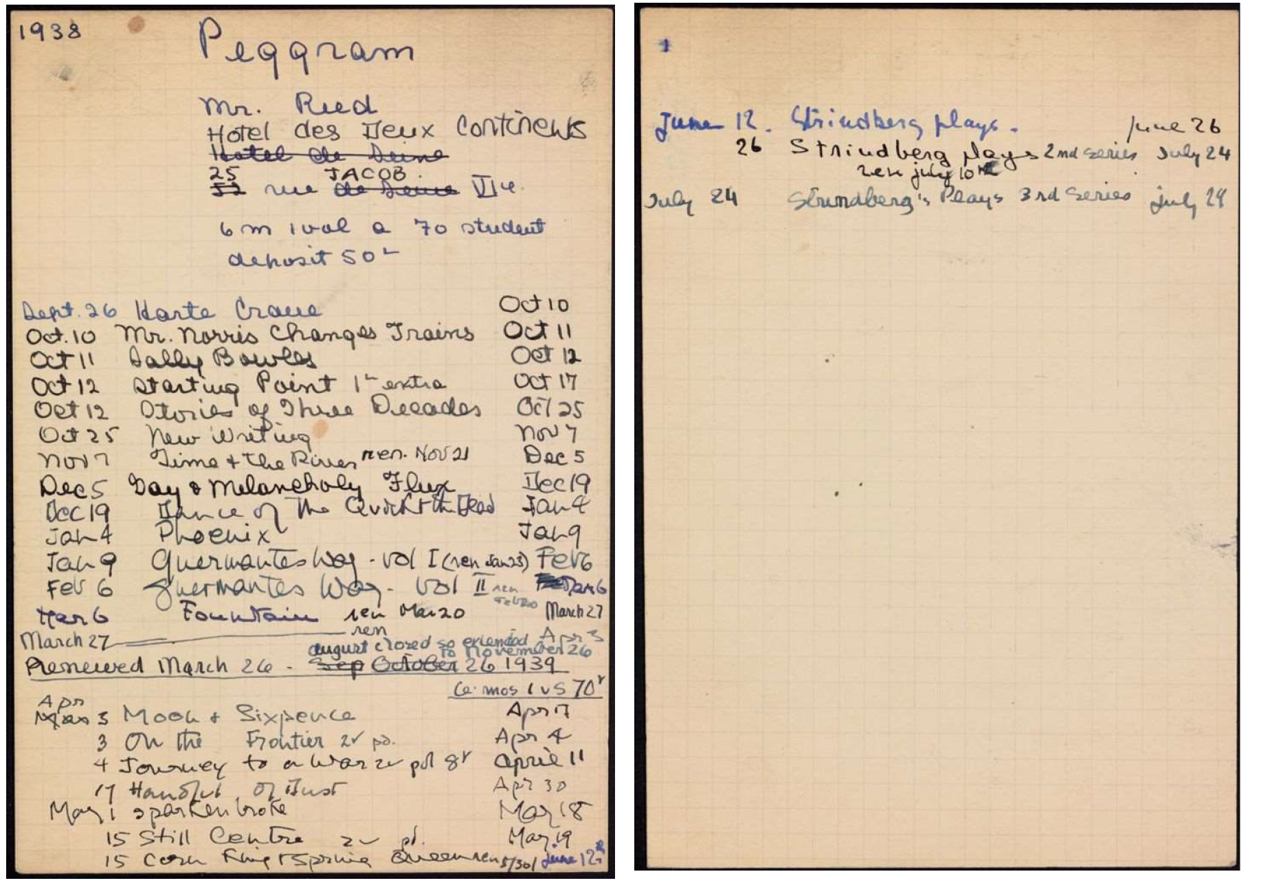Peggram returned his copy of The Fountain by Charles Morgan and renewed his Shakespeare and Company subscription on March 27, 1939. He checked out several more items before ending his membership; he returned the last item he borrowed from the lending library—a volume of Strindberg plays—on July 29.