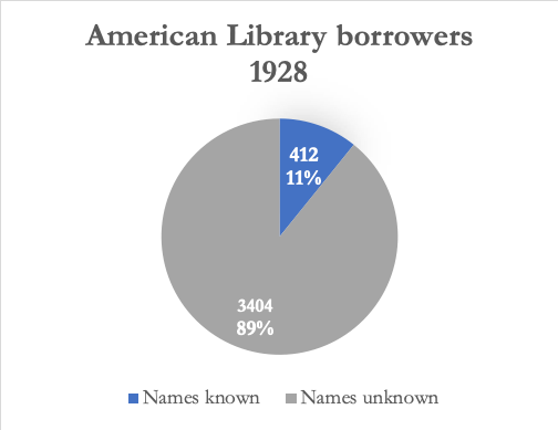 Despite the incomplete data, there is value in comparing these two institutions’ member lists. A comparison of names across the American Library and Shakespeare and Company’s membership rolls reveals that, out of over 900 members identified by the ALP in the 1920s and the more than 5,200 on the SCP’s spreadsheet, there are just thirty definite crossovers.12 This would suggest wild differences in the institutions’ memberships, were one not aware of the partiality of the ALP information. The fact that there are any overlaps means we can surmise that a fuller picture of the ALP would reveal many more people who borrowed from both libraries. This conjecture, reduced to the numeric, suggests that if just ten percent of known names from the American Library yield thirty overlaps, we might expect closer to 300 repeated names if the ALP’s full list of borrowers was available.