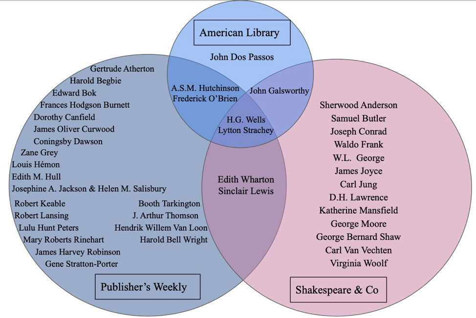 The third snapshot of borrowers’ tastes—the early 1930s—supplies additional evidence of a division between readers in Paris and those in the US. In 1930, ALP librarian Margaret Carmichael told the Herald that “American, French and English residents preferred books by Theodore Dreiser, Sherwood Anderson and Sinclair Lewis, with Joseph Hergesheimer running a close fourth…the library finds the following contemporary authors enjoy wide circulation: Edith Wharton, Willa Cather, Margaret Deland, Hugh Walpole, Katherine Mansfield, and Edna Ferber” (“U. S. Tourists Scorn Fiction” 5). All of these authors were popular at Beach’s bookshop, with her library holding multiple titles by each of them. But in the US, there is no such overlap. Of these ten names, half (Lewis, Walpole, Wharton, Cather, and Ferber) produced American best sellers, while the other five (Mansfield, Dreiser, Anderson, Hergesheimer, and Deland) never made appearances on the Publisher’s Weekly lists.