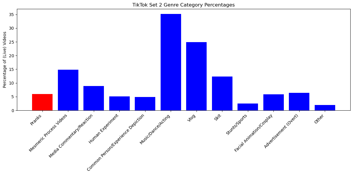 In all but one round of initial independent labeling, Cohen’s kappa for inter-annotator agreement exceeded 0.60. For TikTok set 1, it was 0.58. Still—and for reasons to be discussed further, shortly—the final labels agreed upon through subsequent discussion were retained. Furthermore, before taking final tallies of the labeled videos, the effect of the presence of dead links on the data had to be considered. If dead links were scattered evenly across creators—causing a few creators to lose one or two videos each—then all creators could be retained in the sets without creating undue bias. If, however, the losses were more concentrated, causing some creators to lose most or all of their videos, then those creators should be removed. In the case of the two TikTok sets, dead links were more numerous, comprising 45/1150 videos in set 1 (3.9%) and 23/575 in set 2 (4%). Three creators were highly affected and therefore removed, leaving 112. For the two YouTube sets there were only three dead links in total, all occurring in set 1, and no creators required removal. Once dead links and highly-affected creators were removed, total numbers and percentages of pranks out of the remaining “live” videos were calculated.