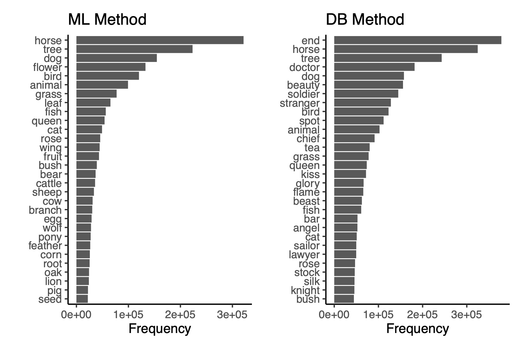 As a way of further validating the two methods, the list of most frequent taxa identified by each method are presented similar to Langer et al. (Fig. 2). One can see here the higher numbers of false positives in the DB method (“end”, “doctor”, “soldier”, “stranger”, etc.). These words do not appear in Langer et al.’s presentation of most frequent taxa, suggesting that there may have been an additional cleaning step of the data after implementation of the database.