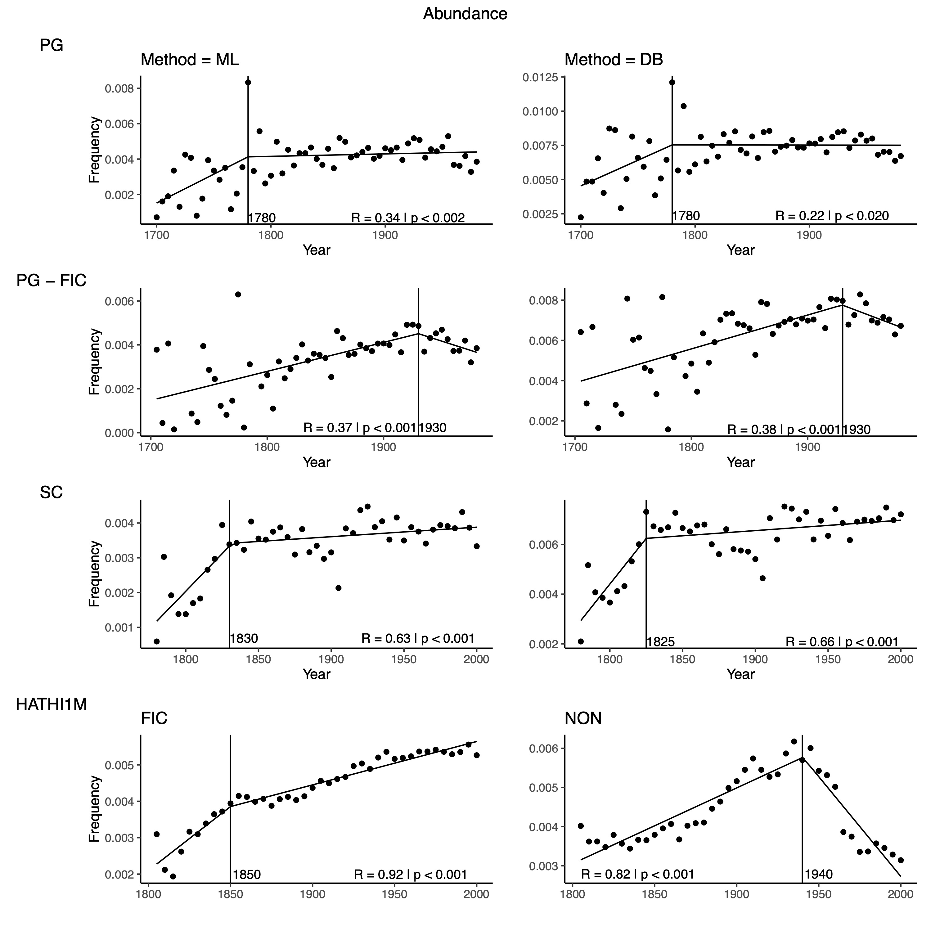 The principal aim of Langer et al.’s paper is to estimate the historical trajectory of the representation of biological taxa in English-language creative writing. They do so by aggregating their data into 5-year periods and then estimating a breakpoint across their historical time period. Their three main graphs are provided (Fig. 3) and then my results (Fig. 4-6). Because the Hathi1M data only provides derived supersense data, I only implement the ML method on this data and only for the Abundance measure. However, I break out fiction and non-fiction separately to illustrate the effects of instrumentality on the estimated prevalence of taxa. I also subset the PG data by only keeping works that have “fiction” in their subject column to observe what effect this has on the results.
