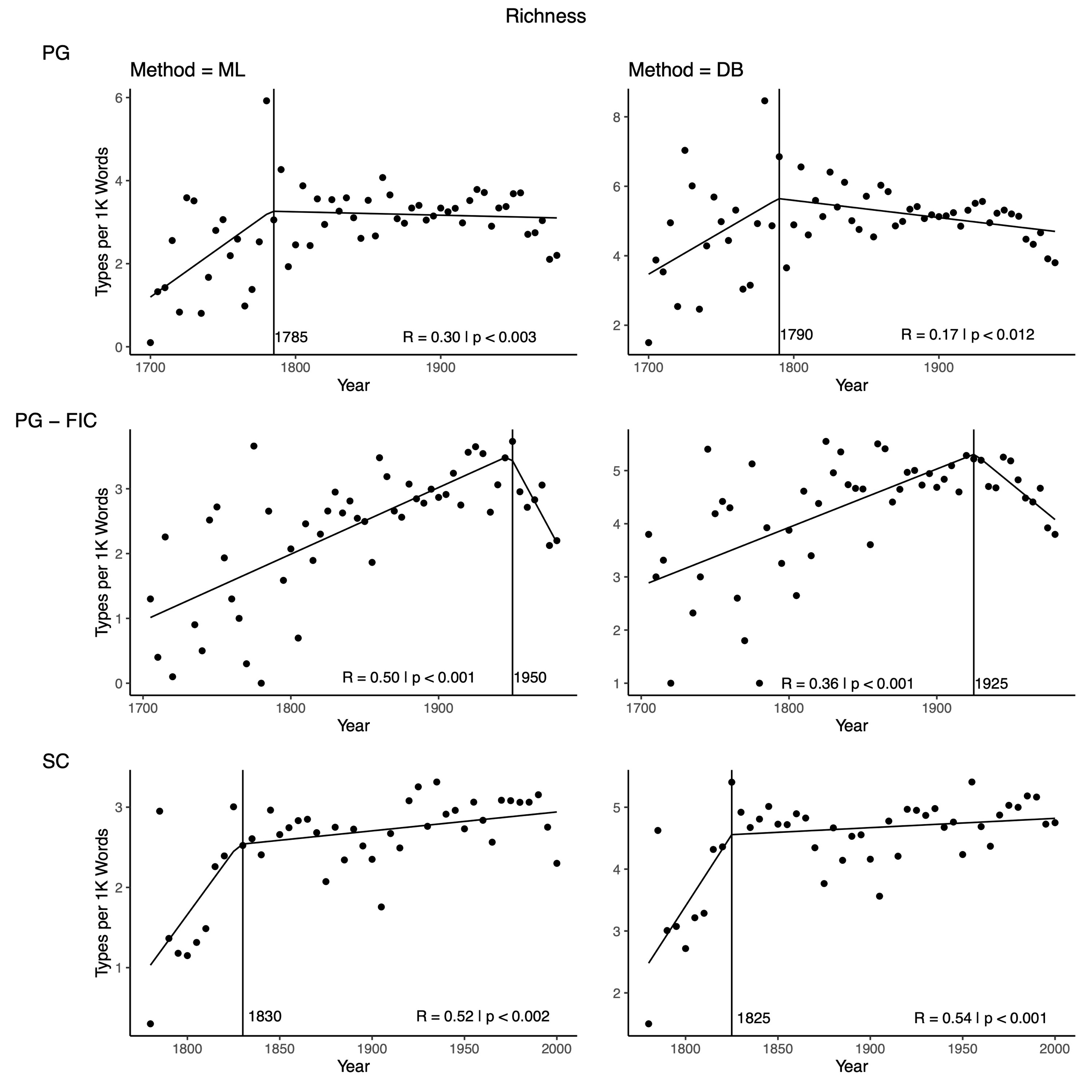 the authors’ breakpoint estimation of meaningful change occurring around the period of 1835 appears to be robust within +/- 15 years for fiction for the two new datasets;