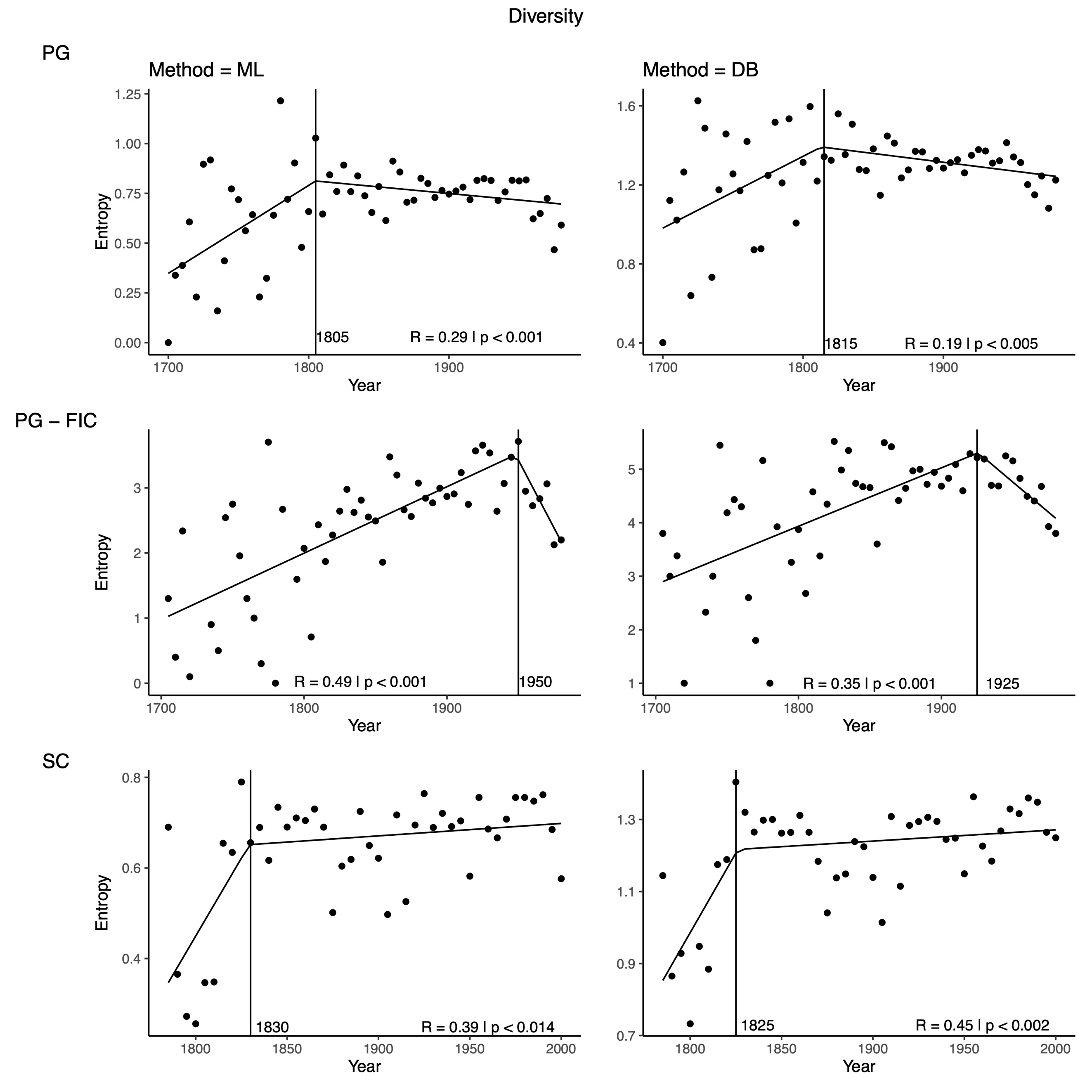 As we can see in Row 1 of Figs. 4-6, the implementation of the DB method applied to the PG dataset partially replicates the results of Langer et al. The estimated breakpoints are consistently earlier, but I either find no rise in the number of estimated taxa or a decline of diversity similar to the original paper.