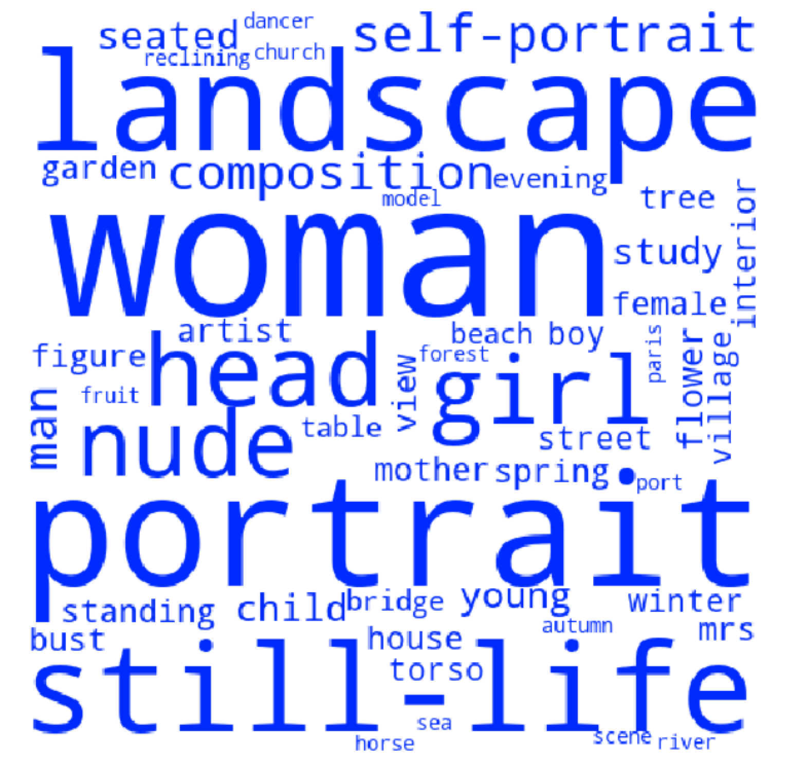 In this article I draw on the metatdata available in online art museum collections. The question I address is that of what text-mining those resources can tell us about the history of modern and contemporary art. My focus is on the titles of the artworks. A small number of articles and monographs have been published on the history of titles in the visual arts, (Gombrich; Bann; Welchman; Hoek; Yeazell). Titles may also play a key role in the readings developed by critics or art historians. The work of all these scholars shows that titles are not merely ways of identifying works of art but are of considerable art historical interest in their own right. Titles have mattered to those involved in the production, distribution and reception of art. They can indicate the subject matter of the work, have been a site for artistic innovation, can have an ideological effect, and influence the general viewer’s or the critic’s understanding and appreciation of the work. Indeed, one of those authors, Stephen Bann, observes that looking at titles is one way of ‘retracing the history of modern art as a whole’ (Bann).