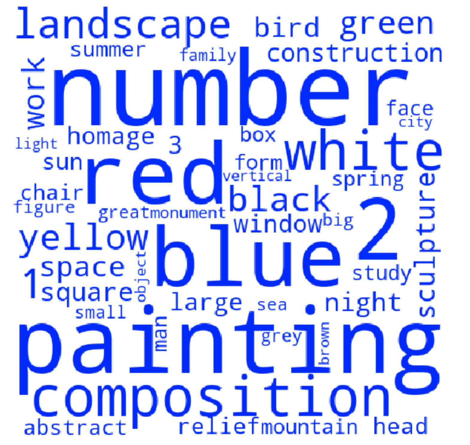 What displaced the figurational uses of titles were mainly those associated with the important words in topic 2. Its word cloud is presented in Figure 4. As that shows, the most important words include those describing the type of work – a painting or a sculpture for instance – or the formal elements of a painting such as shapes and colors, and the way in which they are arranged, with ‘composition’ in the top 10 words of the topic and ‘construction’ also featuring in the top 50. The words ‘abstract’ and ‘form’ are also important in this topic. I would characterise topic 2 as ‘abstract/formal’.