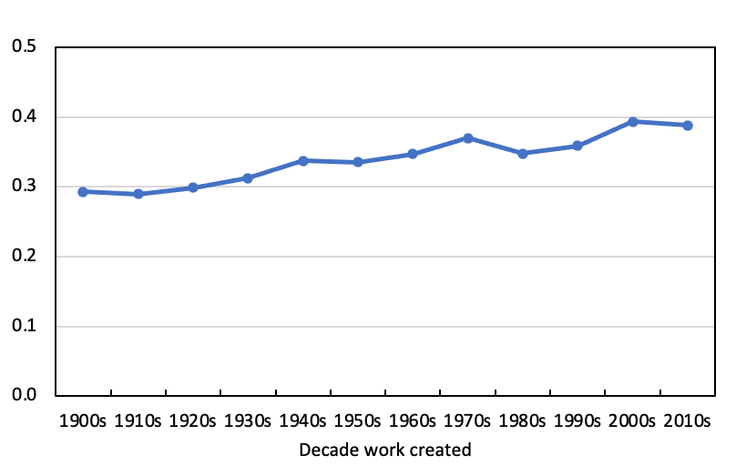 The entropy of the topic distribution in my model for each decade is shown in Figure 6. From an art historical perspective, the absolute levels of the entropy are less important than the change in its value over time. As can be seen, on this measure titling became persistently and significantly more diverse from the 1920s to the 1960s. As artists moved away from signalling a predominant interest in, or engagement with, figuration, in aggregate the words in the titles they used in each decade were sending out a wider range of signals. From the 1960s onwards the diversity of the interests signalled through the titles used for works created in each decade has changed little, with the entropy of the topic distribution roughly constant.