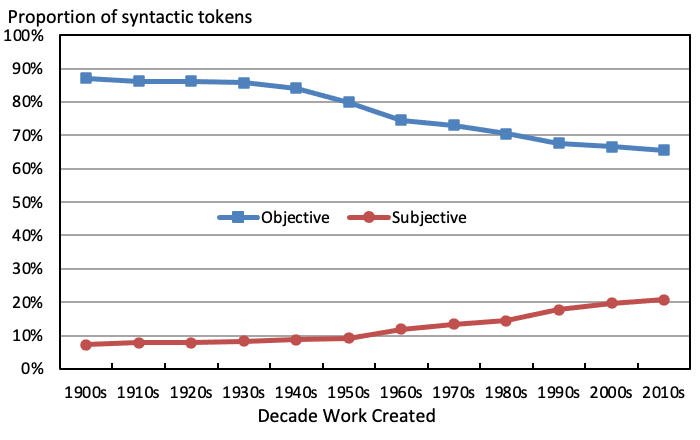 The overall trends in the use of these different parts of speech is shown in Figure 8. For ease of presentation, I have labelled nouns, prepositions, determiners, and adjectives taken together, but excluding all instances of ‘untitled’, as ‘objective’. I have labelled brackets, personal pronouns, end-sentence punctuation, modals, verbs, adverbs, and all instances of ‘untitled’ followed by additional text as ‘subjective’. The remaining syntactic tokens are predominantly ‘untitled’ when used on its own and numerals, which I have excluded as I would not read them as strongly suggesting one epistemic stance or another. As can be seen ‘objective’ parts of speech have fallen from over 80% of all syntactic tokens in the titles of works created in each decade from the 1900s to the 1940s, to 65% in the 2010s. ‘Subjective’ parts of speech have risen from around 10% of all syntactic tokens in the titles of works created in the 1940s to 21% in the 2010s.
